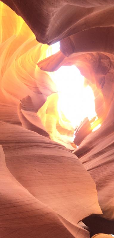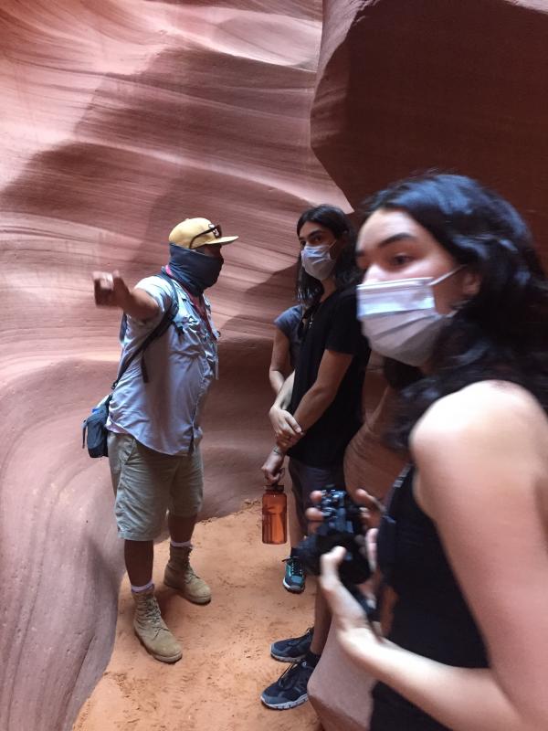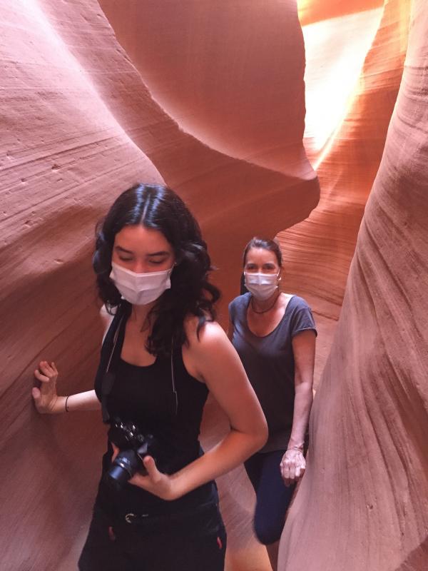 Auch heute stehen wir wieder früh auf, um 8.45 Uhr beginnt unsere Führung im Lower Antelope Canyon, und bis 8.20 Uhr müssen wir eingecheckt haben. Wir nehmen wieder unsere Bauchtaschen und unsere Tochter auch ihren Fotoapparat. Unsere Gruppe besteht aus 8 Personen: uns vieren, zwei Kanadiern und zwei Deutschen. Unser guide ist ein sehr sympathischer Mann um die 40. Er erzählt uns viel über die Navajo, die Diné genannt werden wollen. Und die verschiedenen Indianerstämme sollte man nicht „tribes“ nennen, sondern „nations“. Wir fragen ihm Löcher in den Bauch, und er antwortet bereitwillig auf all unsere Fragen. Im Allgemeinen sind die Ureinwohner Amerikas sehr stolz auf ihre Kultur. Nur seinen indianischen Namen darf er uns nicht übersetzen. Da auf Indianergebiet die Maskenpflicht gilt, tragen wir alle unsere Masken, zum Fotografieren dürfen wir sie kurz abnehmen. Der guide seufzt, er wollte alle wären so korrekt wie unsere Gruppe. Viele der Amerikaner würden sich nicht an die Maskenpflicht halten.