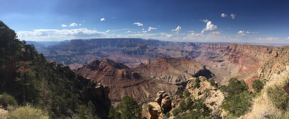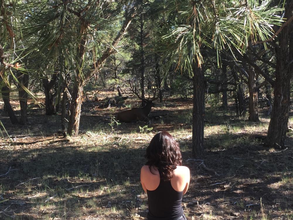 Wir halten auch noch an allen anderen Aussichtspunkten (und finden immer leicht einen Parkplatz, manchmal sind wir die einzigen), am schönsten ist der Lipan Point. Als wir auf der anderen Straßenseite ein Auto am Straßenrand stehen sehen, drehen wir um und fahren zurück. Das Auto ist schon wieder weg, aber als wir genauer schauen, sehen wir im Schatten des Waldes einen großen Hirschen mit riesigem Geweih!