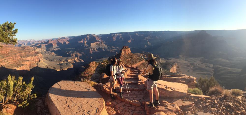 Wir halten uns aber nicht lange auf, um 5.20 Uhr beginnen wir den Abstieg, gut ausgerüstet mit 4 Litern Wasser pro Kopf, viel Elektrolyte-Pulver, Powerriegel, Studentenfutter, außerdem harte Eier, Erdnussbutterbrote und Chips. Außerdem haben wir unsere breitkrempigen Hüte, Halstücher zum Nassmachen, Stirnlampen und Wanderstöcke. Meine Tochter und ich haben dünne, langärmelige T-Shirts an (Tipp des Rangers gestern), die Männer haben sich nicht dazu durchringen können. Ich habe vorsichtshalber meine Kniebandage an, in der Vergangenheit hat mir mein rechtes Knie in den Bergen immer wieder Probleme gemacht…