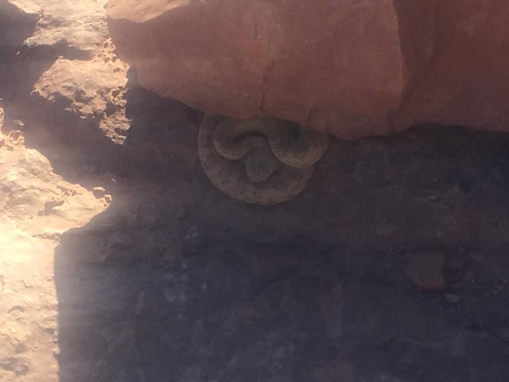 An einem wunderbaren Aussichtspunkt setzen wir uns auf eine Reihe von Steinen, die den trail begrenzen, mein Mann, der noch Fotos gemacht hat, kommt nach und setzt sich zu uns. Wir trinken und essen die ersten Nüsse. Plötzlich macht mein Mann einen Riesensatz und unsere Tochter sagt gleichzeitig: „Schau mal, eine Schlange!“ Mein Mann lässt sich nicht leicht beeindrucken, aber jetzt ist er echt geschockt: unter dem Felsen neben ihm, vielleicht 20 Zentimeter entfernt von dem Platz, wo gerade noch sein rechter Fuß war, liegt eine Klapperschlange. Er hat sich auf diesen Felsen nur deshalb nicht gesetzt, weil er spitz und unbequem war. Die Schlange bewegt sich nicht, sie liegt ganz ruhig da, aber sie ist doch ziemlich groß. Wir stehen jetzt alle in gehöriger Entfernung um den Felsen herum, ein paar Fotos machen wir, aber die Schlange liegt im Schatten und wir möchten nicht näher ran. Unser Sohn meint, vielleicht gehe es ihr nicht gut, da sie nicht klappert, und möchte mit dem Wanderstock ein bisschen vor ihr auf den Boden klopfen. Mein Mann und ich schimpfen gleichzeitig los, und unser Sohn verzichtet darauf, die Schlange zu stören. Dann laufen wir weiter, mein Mann ist immer noch geschockt: was wäre passiert, wenn sie ihn gebissen hätte, wir sind schon sehr weit unten. Unser Handy geht natürlich nicht. Wir spinnen den Faden noch ein bisschen weiter, aber zum Glück ist ja nichts passiert. Von nun an werden wir noch vorsichtiger sein, obwohl wir eigentlich dachten, wir seien vorsichtig, immer mit dem Stock voraus, wo man nicht gut sieht… Die Schlange war übrigens eine Grand Canyon rattle snake, wie uns der Besitzer des rattle snake Museums in Albuquerque sagt, als wir ihm das Foto zeigen.