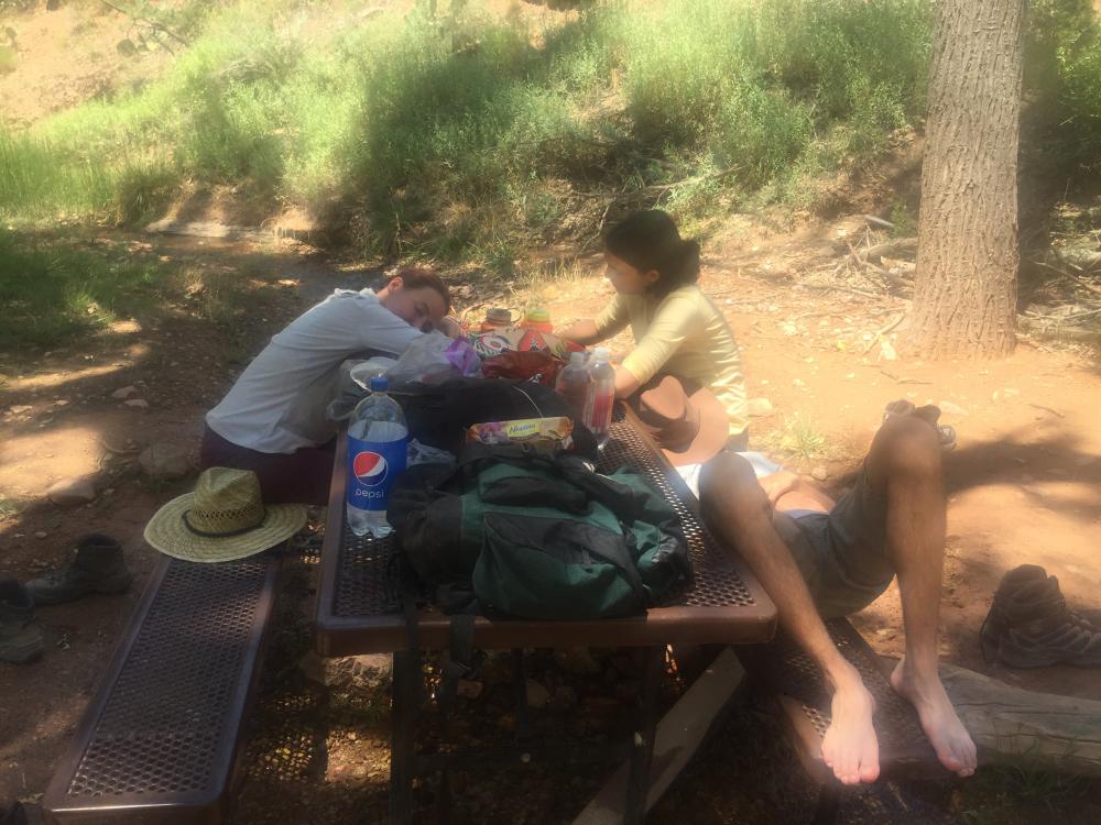 Die Hitze setzt uns gewaltig zu, und ich beginne, mich unwohl zu fühlen. Immer wieder mache ich mich nass, aber ich fühle eine leichte Übelkeit und als ob es mir schwindelig ist (ist es mir nicht wirklich, aber es ist schwer zu beschreiben, auf Englisch wäre es dizzy). Auch meine Tochter klagt, dass es ihr nicht gut gehe. Mein Mann macht uns allen Mut, bei jeder Biegung verspricht er uns, dass dahinter der Indian Garden liege. Leider stimmt es nie. Die Männer teilen sich auf: unser Sohn läuft mit mir, mein Mann und unsere Tochter kommen nach. Ich hefte mich an die Fersen meines Sohnes und schaue nur auf seine Füße: ein Schritt, noch ein Schritt, und noch ein Schritt, und so weiter. Zwischendrin mache ich mir große Vorwürfe, dass ich meine Familie in diese gefährliche Situation gebracht habe. Wir haben zwar immer noch sehr viel Wasser, genug um es uns auch immer wieder über den Kopf zu gießen, aber es ist einfach zu heiß. Wir laufen und laufen, hört dieser trail denn nie auf? Um für diese Ferien fit zu sein, bin ich das ganze Schuljahr zu Fuß zur Arbeit gelaufen: 3,5km hin, 3,5km zurück. Jetzt denke ich, wie weit auf meinem Schulweg ich denn sein würde, ich versuche zu erraten, wie viel noch fehlt. Unser Sohn kümmert sich lieb um mich, ihm geht es gar nicht schlecht! Endlich, endlich, nach ca. eineinhalb Stunden, stoßen wir auf den Bright Angels Trail. Ich lasse mich mit hochrotem Kopf unter den ersten Baum im Schatten fallen, und sitze da erst mal eine Weile. Auch die anderen setzen sich und rasten. Nach einer halben Stunde ca. steht mein Mann auf und läuft noch ein Stück weiter, das hier ist ja noch nicht der Indian Garden. Als er wiederkommt, erzählt er, dass wir nur 100 Meter weitergehen müssen, da gibt es Bänke und Wasser, auch einen Bach. Nur mühsam lassen wir uns überzeugen, aber dann gehen wir mit und setzen uns auf die erste Bank im Schatten. Aber mein Mann ist immer noch nicht zufrieden: er hat entdeckt, dass jemand eine ganze Tisch-Bank-Kombination in den kleinen Bach gestellt hat, und besteht darauf, dass wir nochmal aufstehen und erst dort unsere Pause machen. Gut, dass er so hartnäckig war, hier ist es wirklich schön. Wir ziehen Schuhe und Strümpfe aus, kühlen unsere Füße im Wasser: es ist angenehm frisch, nicht zu kalt, wir lassen unsere Füße während unserer gesamten Rast im Bach. Jeder ruht auf seine Art aus: unser Sohn und ich schlafen, mein Mann liegt entweder auf einem großen Stein im Bach oder er läuft ein bisschen herum, unsere Tochter schreibt Tagebuch (Wow! Wie schafft sie das?).