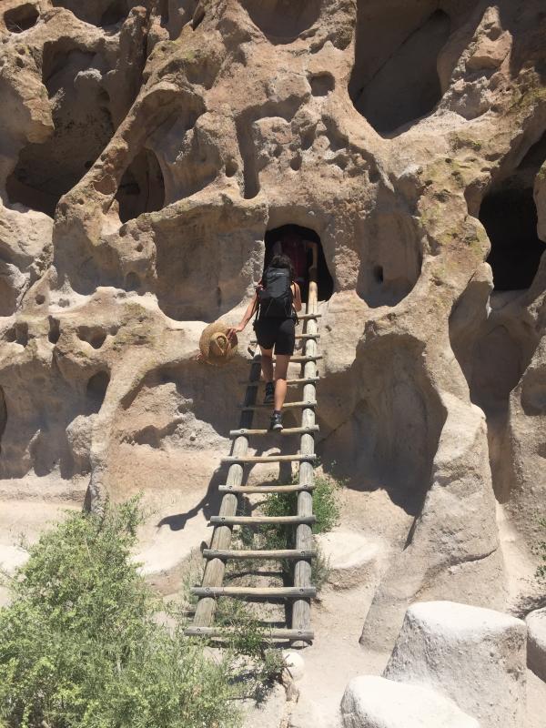 Dort gibt es noch ein Visitor Center, das wir besichtigen, dann laufen wir los. Das Tal ist sehr weit, der Pueblo Loop (1.4 miles) asphaltiert und gepflegt, für Rollstühle und Kinderwagen sehr gut geeignet. Die erste Sehenswürdigkeit ist Tyuonyi, eine alte Siedlung unten im Tal. Sie war zur selben Zeit bewohnt wie die Cliff Dwellings, zu denen wir jetzt laufen. Das sind Höhlen, in denen die Vorfahren der Indianer, die Anasazi, gewohnt haben. Man kann auf Leitern hinaufklettern und in die ziemlich keinen Höhlen hineinsteigen.