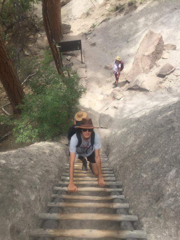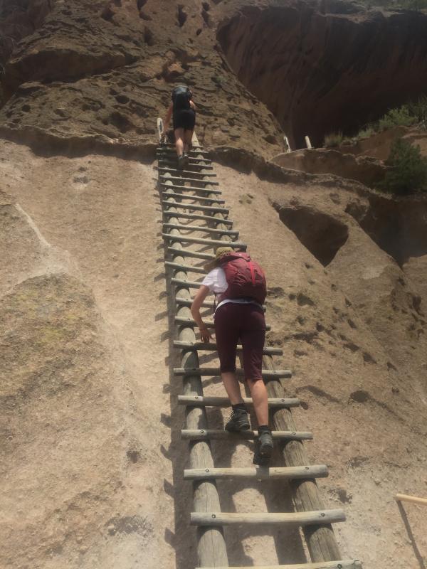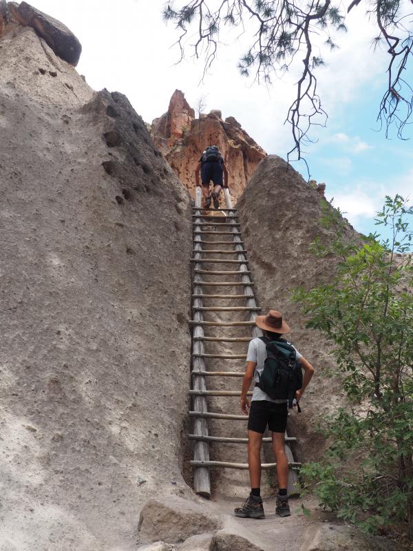 Am hinteren Ende des Rundwegs beginnt der Frijoles Trail zum Alkove House, wo früher um die 25 Anasazis gewohnt haben sollen. Dieser Trail ist nicht mehr asphaltiert, aber trotzdem gut zu laufen, weil eben. An einem schönen schattigen Plätzchen mit Bank machen wir unser Picknick, dann laufen wir zum Alkove House. Mehrere Leitern führen 43 Meter nach oben bis zu dem Riesenüberhang. Schwindelfrei sollte man hier schon sein und auch keine Probleme mit den Händen haben. Vor 30 Jahren habe ich hier mal eine Frau gesehen, die weder vorwärts noch rückwärts konnte, sie hat alles blockiert. Aber diesmal sind außer uns nur noch 2 oder 3 Familien da, oben sind wir längere Zeit ganz allein, und auch der gefürchtete Gegenverkehr auf den Leitern bleibt aus.