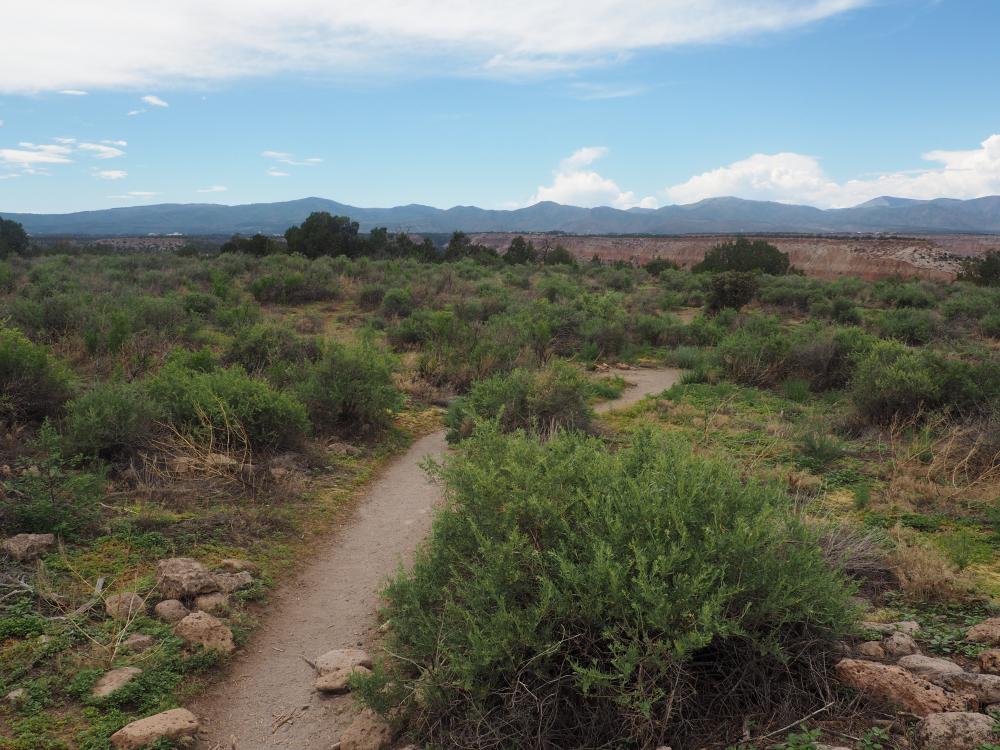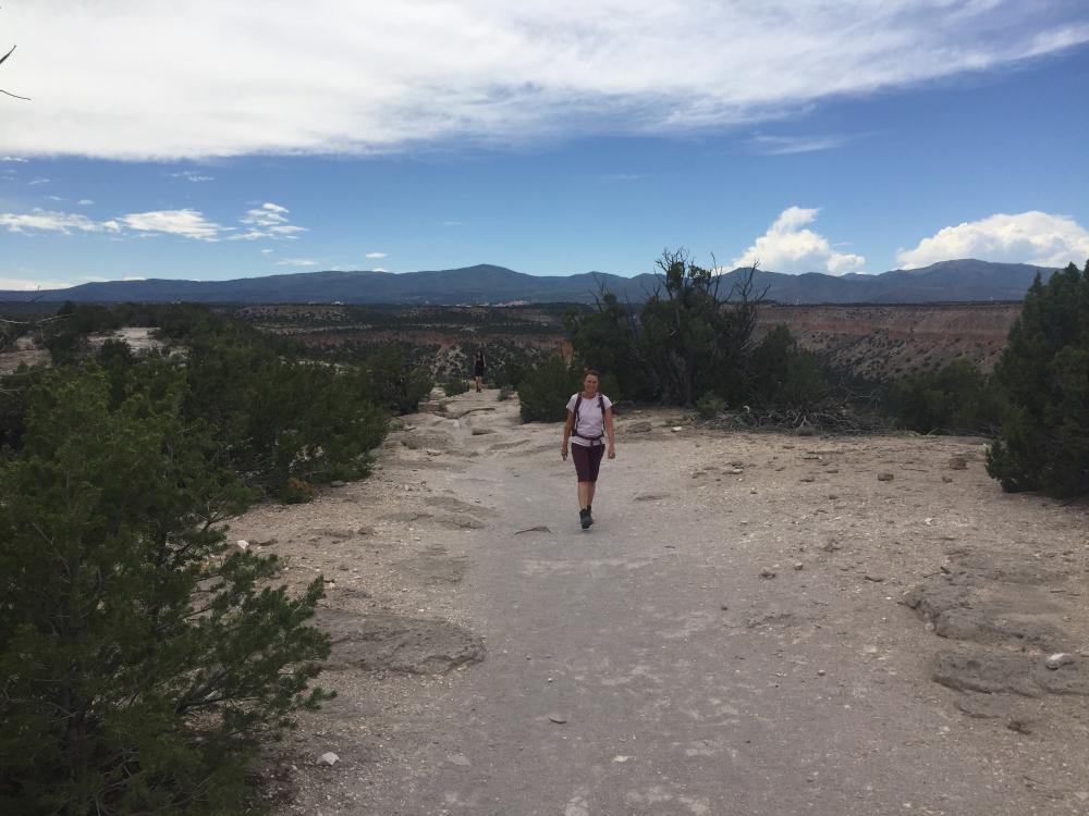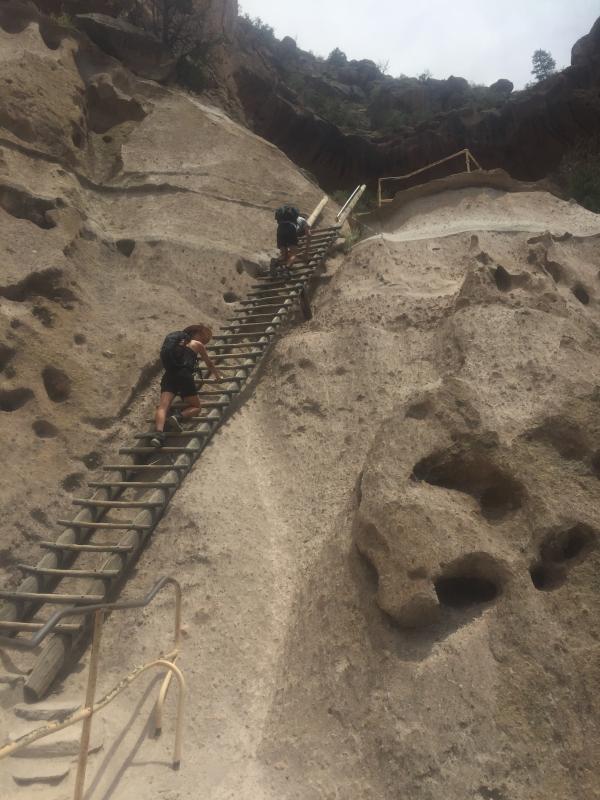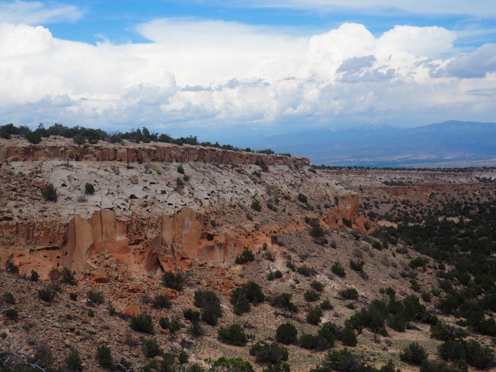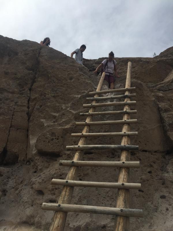 Als wir wieder oben in unserem Camper sind, fahren wir los in Richtung Santa Fe. Auf der Herfahrt hatte ich einen kleinen Parkplatz gesehen mit einem Schild Tsankawi, Bandelier National Monument, und da wir noch Zeit und Lust haben, bleiben wir jetzt hier stehen und laufen noch einen trail. Das hat sich sehr gelohnt, der trail ist kurz (1.5 miles) und einfach, aber wirklich schön. Erst geht es auf eine kleine mesa hinauf, von der man eine wunderbare Aussicht hat. Oben läuft man dann einen schmalen Weg, vorbei an mehreren alten Anasazi-Siedlungen, die teilweise noch gar nicht ausgegraben sind. Schließlich muss man eine längere Leiter hinuntersteigen, um auf den schmalen trail zu kommen, der am Berg entlang verläuft. Auf der mesa waren wir den einzigen anderen Leuten begegnet, einer Familie, die denselben Weg zurückging, weil ihre Kinder sich nicht die Leiter hinuntergetraut hatten.