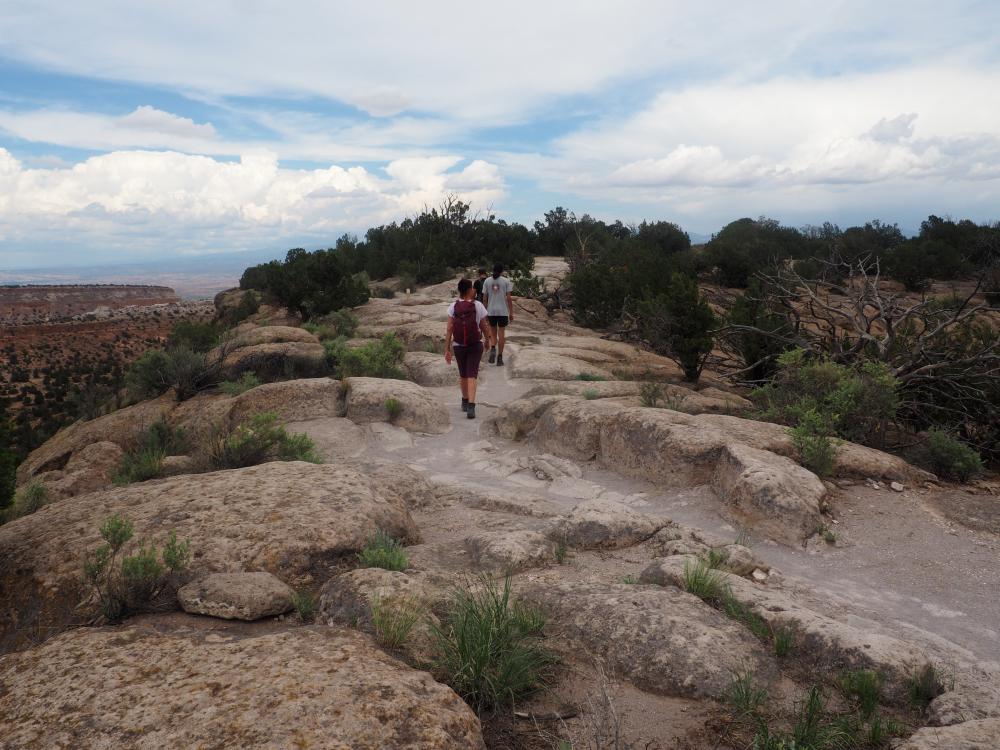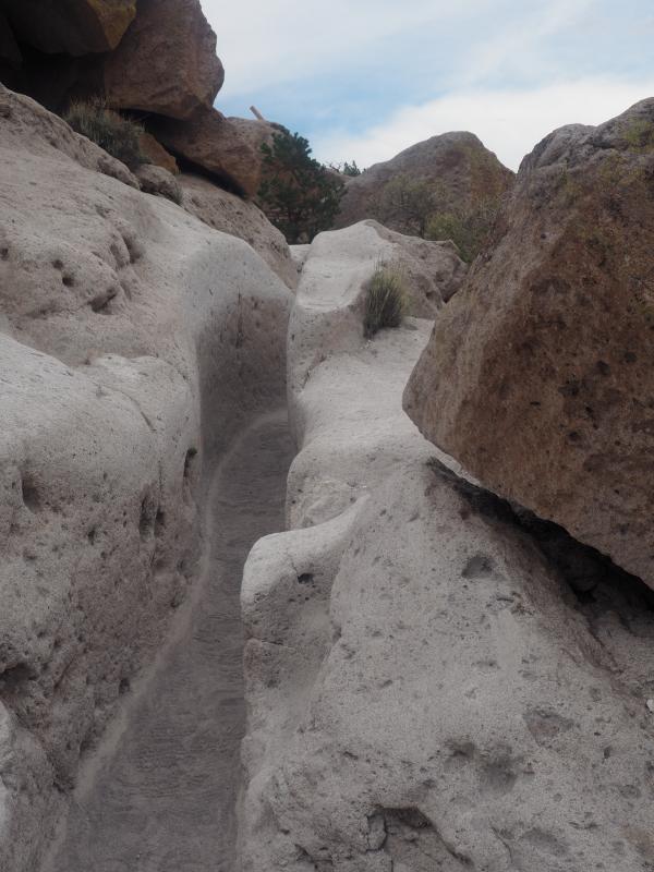 Der Rückweg ist ziemlich einzigartig, man läuft durch eine schmale schneeweiße Rille, für die Füße meiner Riesen an vielen Stellen eine Herausforderung. Wir rätseln, ob der Mensch oder das Wasser diese Rillen geschaffen hat. Das Wasser kann es eigentlich nicht sein, denn die meisten Rillen führen zwar nach unten, aber oft auch horizontal… Stolpern sollte man hier nicht, da es an vielen Stellen steil nach unten geht. Ich habe übrigens zu Hause gegoogelt: die Rillen wurden von den Anasazi gemacht, das waren ihre Wege (die müssen kleine Füße gehabt haben). Auch Petroglyphs und Höhlen gibt es hier. An manchen Stellen liegen alte Tonscherben; wenn man welche findet, soll man sie dazulegen, habe ich irgendwo gelesen. Tsankawi hat mir außerordentlich gut gefallen, besser als Bandelier!