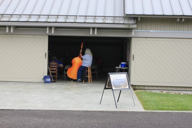Pünktlich zur letzten halben Stunde der Midday Mountain Music kommen wir am Blue Ridge Music Center an und können den Locals noch ein wenig zuhören. In der Scheune des Music Centers spielen Einheimische mittags jeden Tag bis vier Musik. Wir sitzen in der Sonne und lauschen. (Eigentlich ist der Zuschauerraum innen im Gebäude, auf der anderen Seite der Musiker, deshalb drehen sie uns den Rücken zu.)