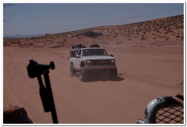 Die Gruppen sind diesmal groß, wir sind mit 12 anderen zusammen und müssen auf einen offenen Truck ähnlich wie bei der Monument Valley Tour. Uns wird gesagt das die Fahrt rauh wird und holperig und dann geht es los. Ich komme mir vor wie auf einem Camel und wir werden wieder paniert Nach ca 15 Min. sind wir am Canyoneingang und da stehen schon jede Menge andere Wagen. Wir machen unsere Tour durch den Upper Antelope Canyon und wären noch mehr begeistert wenn nicht so viele Menschen da wären.