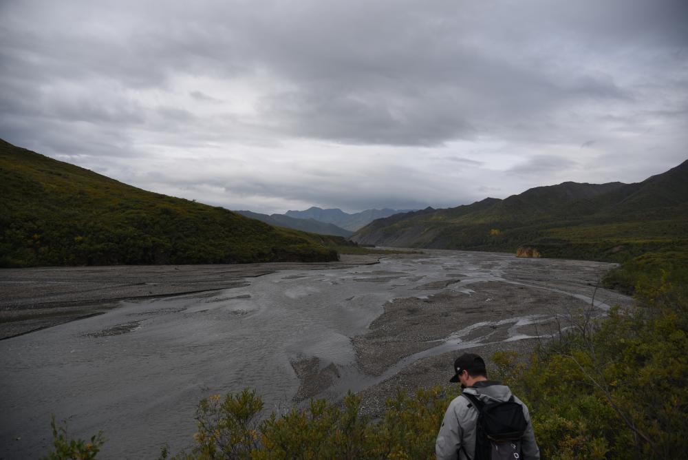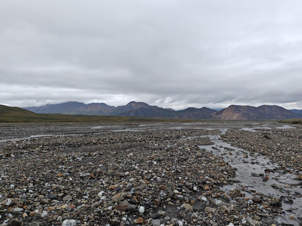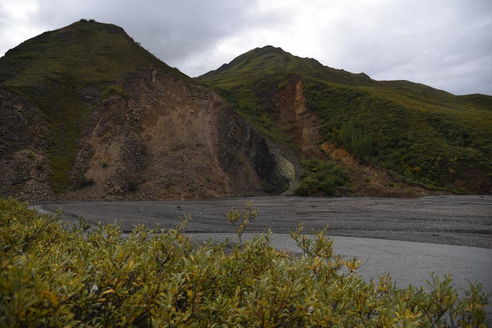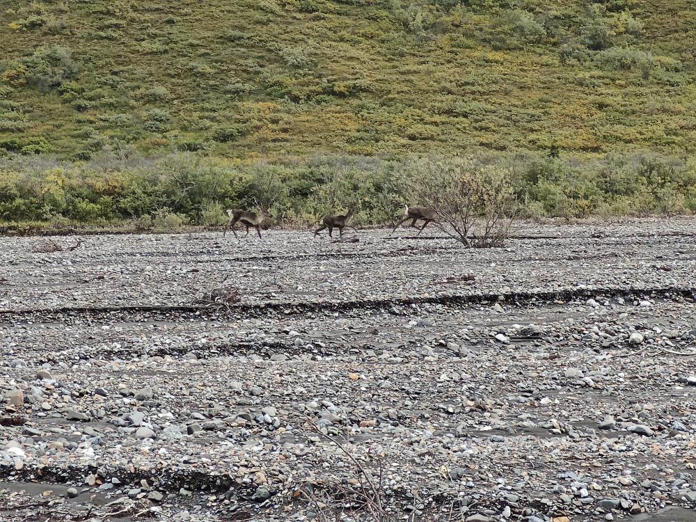 Wir steigen also aus und steigen über eine Treppe auf ein grosses Flussbett aber nur mit einem Bach. Von nun an können wir unseren eigenen Weg suchen. Wir gehen zuerst am Bach entlang Richtung Norden. Irgendwann kommen wir nicht mehr weiter, also wieder einmal Schuhe aus und rüber. Von dort geht es einen kleinen Hügel hinauf. Unterwegs gibt es immer mal wieder Heidelbeeren direkt vom Busch. Da wir vor uns noch 2 andere Wanderer haben, entscheiden wir uns kurzerhand eher links zu gehen und nicht rechts den anderen zu folgen. Kurze Zeit später sind wir ganz alleine. Umgeben von Sträuchern, Büschen und Wiesen. Die Wiesen sind besonderen tückisch, da sie zum darüber gehen einladen aber eigentlich auf einem Tümpel wachsen. Die Büsche und Sträucher sind manchmal Knie hoch, manchmal Hüft hoch und teilweise auch über 2 Meter. Der sehr weiche Boden erschwert das Gehen zusätzlich. Eine Zeit lang verfolgen uns dann auch noch neugierige Caribous. Einen Bären sehen wir allerdings nicht. Wir erreichen einen neuen Bach und folgen diesem weiter. Dies wurde uns aber schnell wieder langweilig und so erklimmen wir einen grösseren Hügel. Den Aufstieg suchen wir uns selber und so geht es im Zickzack auf die Spitze. Tolle Aussicht und meilenweit niemand sonst. Wir beenden unsere Runde auf dem Kamm und erreichen 5 Stunden später wieder die Bushaltestelle. Echt ein super Erlebnis. Dann geht es mit dem grünen Bus zurück. Wir sehen nochmals einen Bären, aber noch weiter weg.