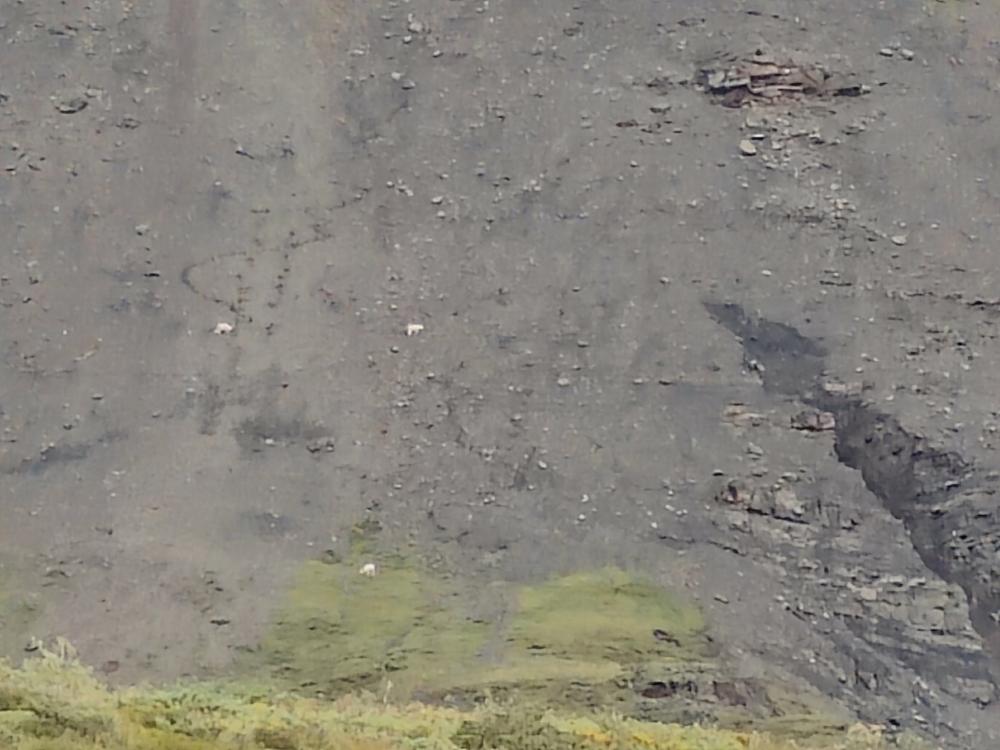 Zum Abschluss sehen wir dann noch ein paar Dall-Schafe. Oder bewegende weisse Flecken auf schwarzen Grund. Sie waren so weit weg, dass man sie nur mit dem Fernglas beobachten konnte. Auf unserer 1 stündigen Fahrt haben, wir aber bereits Freundschaften geschlossen und so hatte ich immer ein Feldstecher griffbereit. Die Dall-Schafe waren übrigens auch der Hauptgrund, wieso der Nationalpark gegründet wurde. Aktuell leben ca. 3000 Tiere im Park.