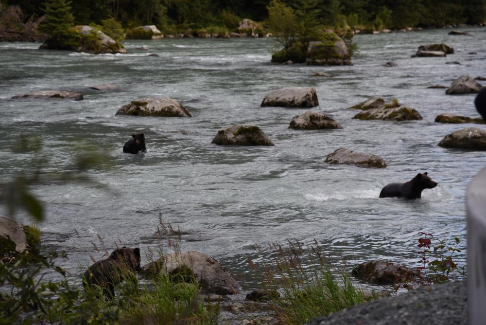 Als es langsam dämmert laufen wir nochmals zu den Bären. Da kommt auch schon ein Wildlife-Ranger auf uns zu und fragt, ob wir die Bären nicht gesehen haben. Wir haben sie gesehen und er wundert sich, wie entspannt wir durch gelaufen sind. Dann kommt noch eine Bärin mit Drillingen. Die werden für uns auch zum Problem. Den es wird immer dunkler, das heisst es kommen immer mehr Bären und man sieht sie nicht mehr und die Bärin hat ihre Drillinge am Ufer der Strasse, an deren wir entlang müssen positioniert. Sie macht auch nicht den Eindruck, dass sie gleich gehen würde. So hören wir dem Ranger noch etwas zu. Geklungen hat es etwa so, wie wenn man die Serien auf DMAX über die Wildhüter in Texas schaut. Auch seien Elche viel aggressiver als Bären und er sei schon mehrmals von einem Elch gejagt worden. Irgendwann fragen wir ihn dann, ob er es auch als sicher genug einschätzt, um zu gehen. Die Mutter ist ziemlich weit im Fluss. Er meinte dann er fahre uns, was wir dankend ablehnten, da wir uns selber in die Situation gebracht haben. Dann meinte er solange, man sie sehe, sei es kein Problem. Aber er begleite uns zu Fuss. Also bekamen wir eine Eskorte von einem Ranger. So was von unnötig und das Beste war, am Schluss fragt er mich, ob ich die Jungen gesehen habe, weil er frage sich, wo sie geblieben sind. Meine Antwort: Ja klar, die standen am Strassenrand. 5 Meter hinter uns und keine 3 Meter von uns entfernt. Die Eskorte hat also sehr viel gebracht. Er hat die Gefahr nicht mal gesehen. Aber 3 Meter Abstand zu wilden Bären war dann auch genug und wir liefen im halbdunkeln zurück zum Campingplatz. Bären haben wir zum Glück keine mehr getroffen. Was für ein Tag!