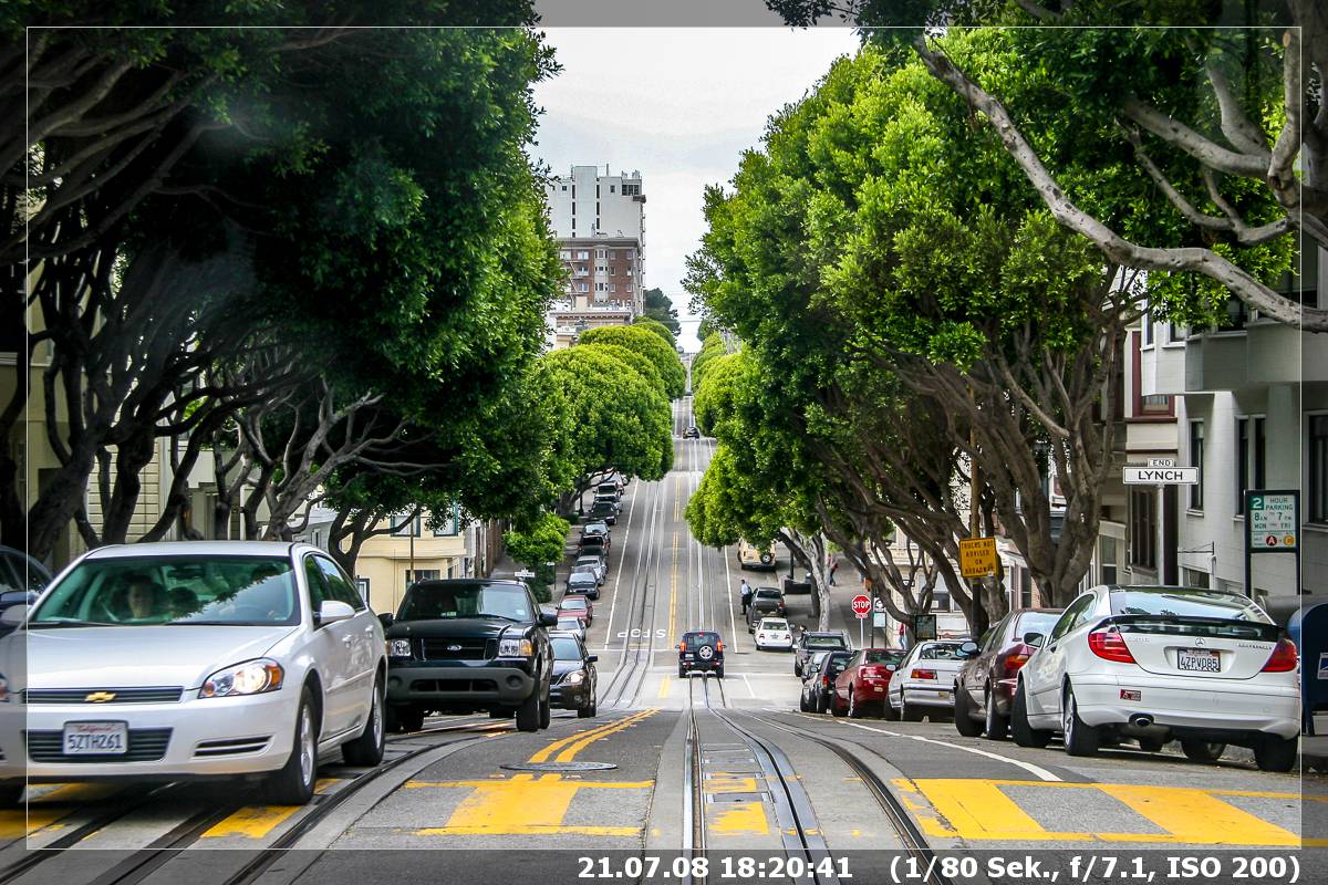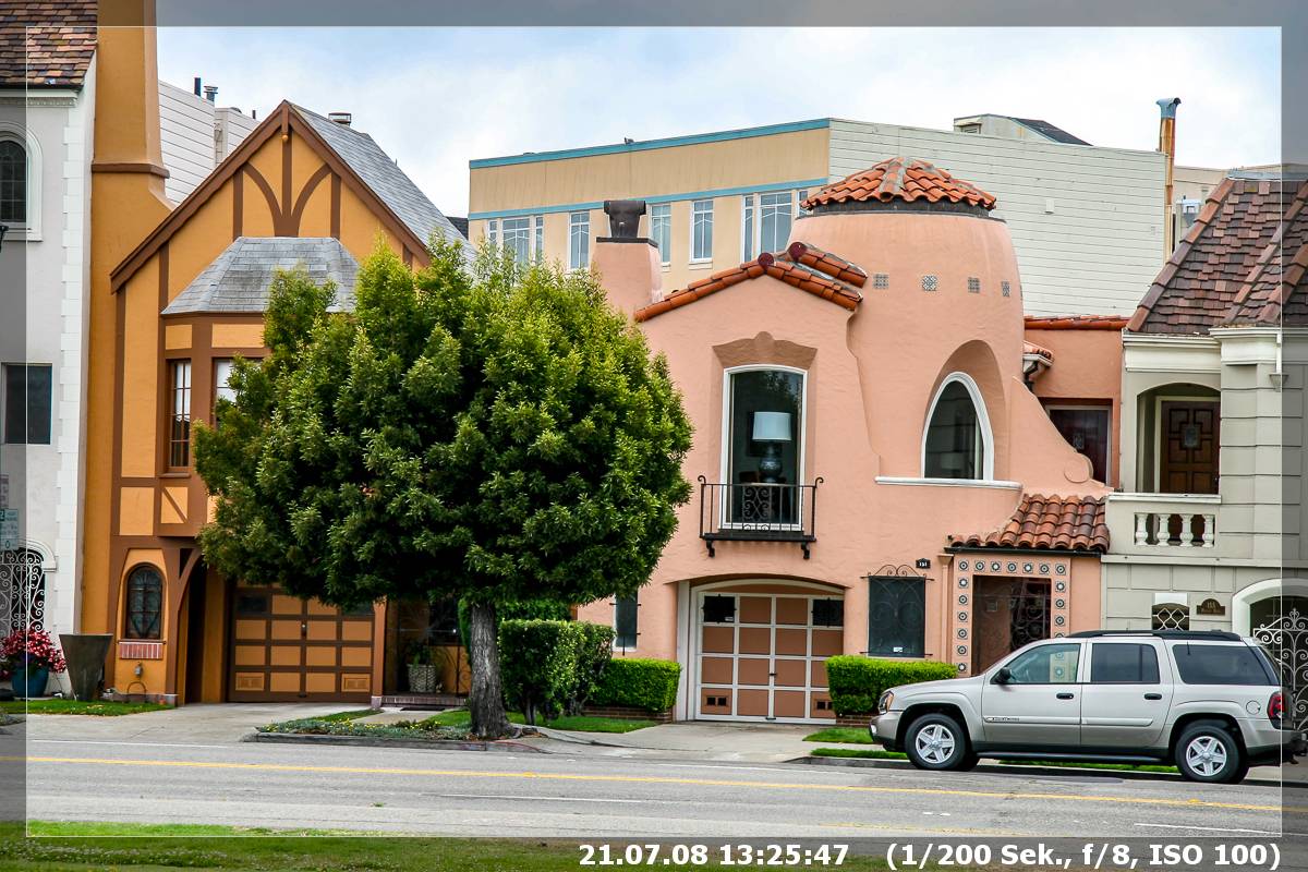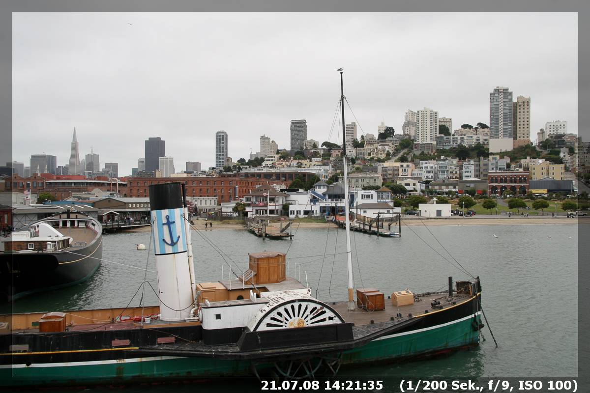 Heute wollten wir auf alten Spuren SFO erkunden. Vor acht Jahren – also im Jahr 2000 – waren wir damals mit nur einem Kind – im Motel Broadway Major Inn an der Van Ness Ave Ecke Broadway. Ebenfalls dort war ein sehr leckerere typisch amerikanischer Diner, „Peters Diner“, den wir auch heute zum Frühstück ausprobieren wollten. Sorgen machte mir nur das Parken dort in der Gegend. Die Fahrt vom Candlestick RV Park war problemlos, unser TomTom führte uns sicher durch das Strassenwirrwarr, eine knappe halbe Stunde später setzte ich die Family vor Peters Diner ab und machte mich auf die Suche nach einem Parkplatz. Eigentlich waren es zwei Parkplätze, die ich dann zwei Blocks weiter fand (glücklicherweise kurz vor einer Kreuzung, sodass ich nach vorne freie Fahrt hatte), also musste ich auch zwei Parkuhren füttern. Ich hatte tatsächlich noch 8 Quarters in der Tasche