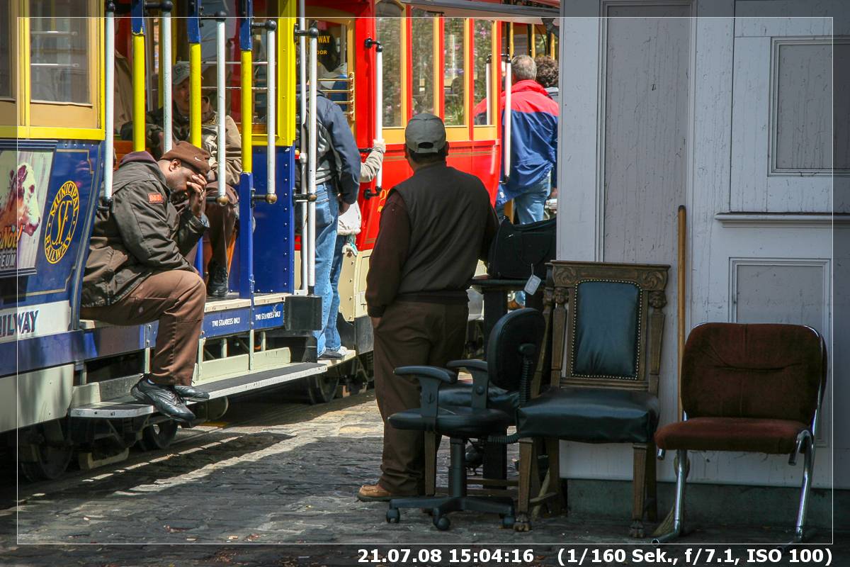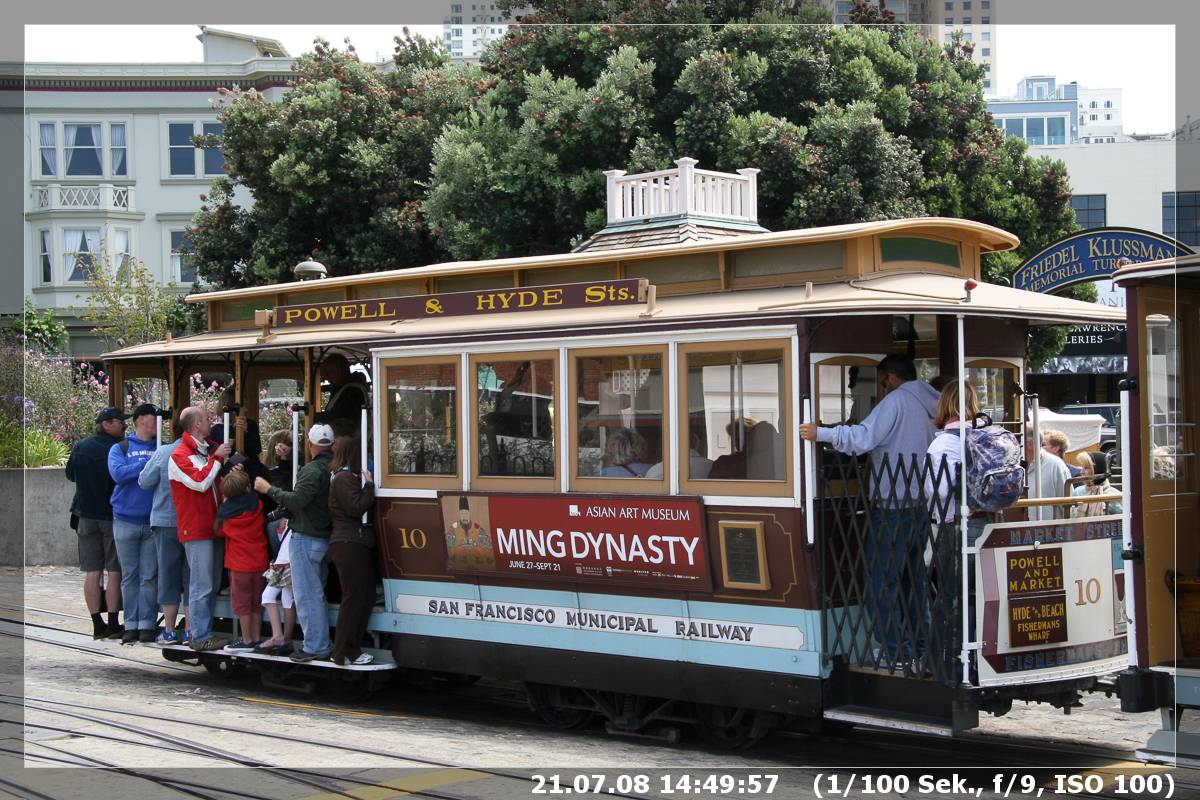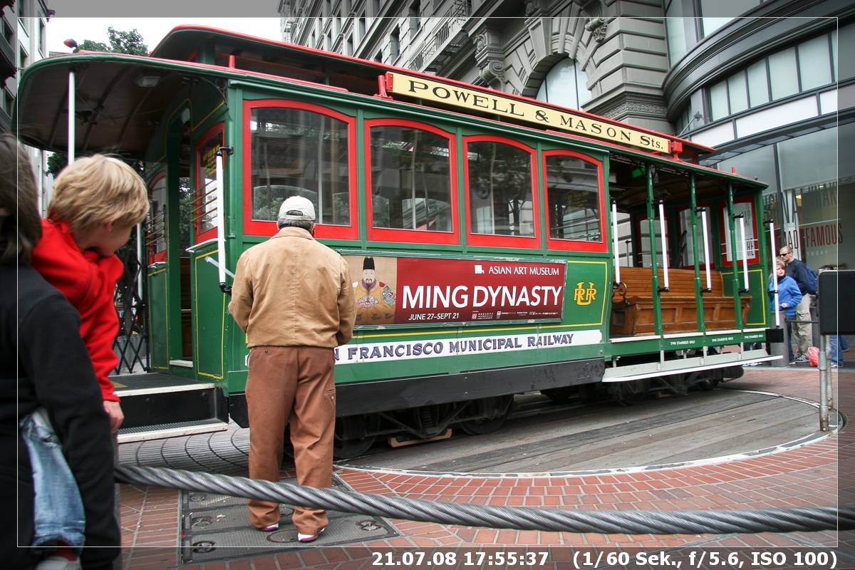 Also ging es wieder zurück zum Cable Car. Während wir dort warteten und zusahen, wie die Cable Cars gedreht wurden, ging meine Frau noch einmal „kurz“ in einen Laden. Mit einem Schal kam sie dann wieder heraus – der Sommer in San Francisco halt