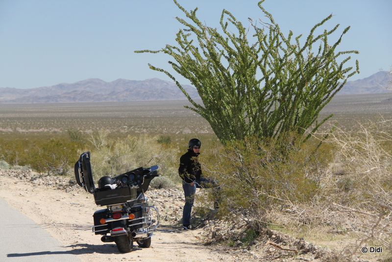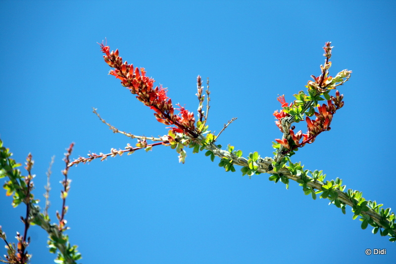 Bei der Weiterfahrt kommen wir an Ocotillo Büschen vorbei. Diese grosse Pflanze hat stachelige grüne Äste mit schönen roten Blüten nur im Frühjahr, den Rest des Jahres sind es meist unscheinbare blattlose „Stengel“.