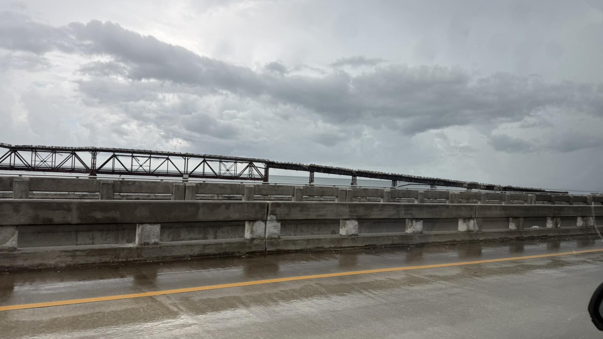 Nach einem Frühstücks-Stop bei Panera Bread  wurde das Wetter auf dem Weg zu  und auf den Keys immer schlechter und zwischendrin fuhren wir mitten durch ein riesiges Gewitter, das direkt über uns wütete. Donner folgte unmittelbar direkt nach Blitz, es schüttete wie aus Kübeln. Anhalten war gefahrlos definitiv nicht drin und so hängten wir uns notgedrungen an einen vor uns fahrenden Wagen, während Blitz und Donner direkt über uns tobten… Beide Autos im Schneckentempo, beide Warnblinker an. Ob noch weitere Autos hinter uns fuhren, kann ich nicht mit Sicherheit sagen. Durch das Stoffdach des Cabrios hörten sich die Regenmassen und der Donner nochmals bedrohlicher an, wir stellten uns die Frage, on das Prinzip des Faraday’schen Käfigs auch in Cabrios mit nassen Dächern funktionierte. Wir wollten es lieber nicht googeln. Die Straßen waren teilweise richtig überflutet und wir wussten nicht, ob der Rest der Strecke überhaupt passierbar war.  Nach gefühlt endloser Zeit wurde der Regen dann doch etwas weniger und wir konnten etwas durchschnauben. Es kam die Überlegung auf, umzudrehen und die Fahrt nach Key West nicht weiterzuführen. Aber, wann kommt man hier mal wieder hin? Da auch der Himmel leicht aufriss, entschlossen wir uns, doch weiterzufahren. Spoiler: Das blieb nicht lange so…