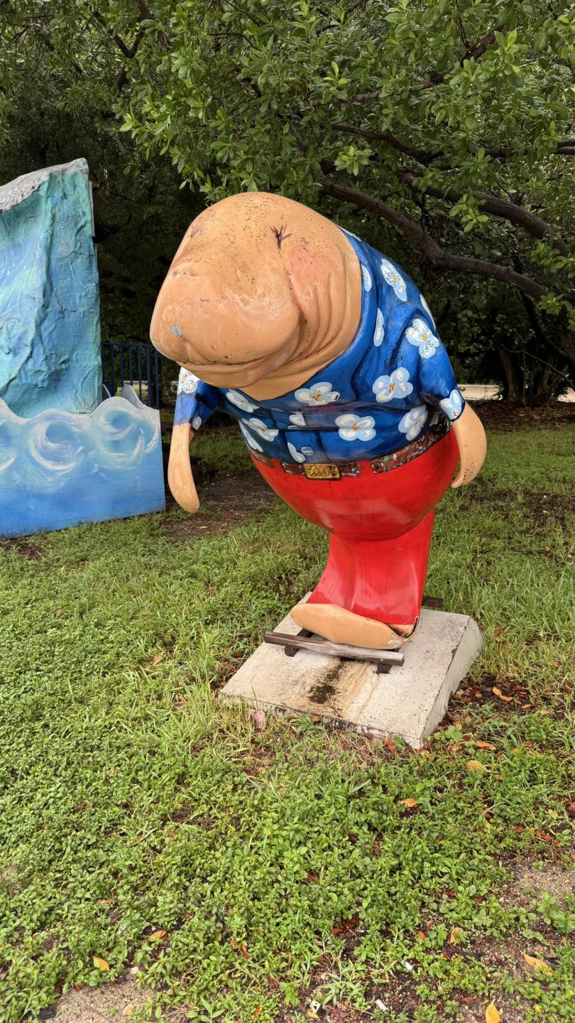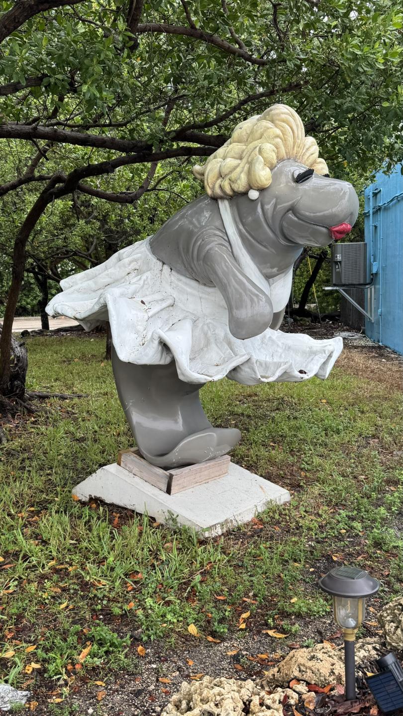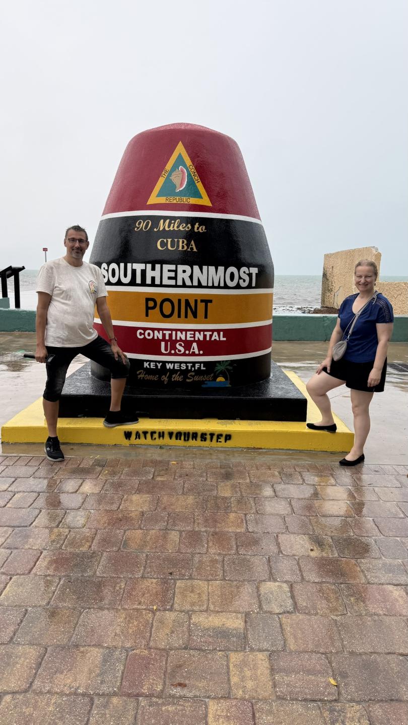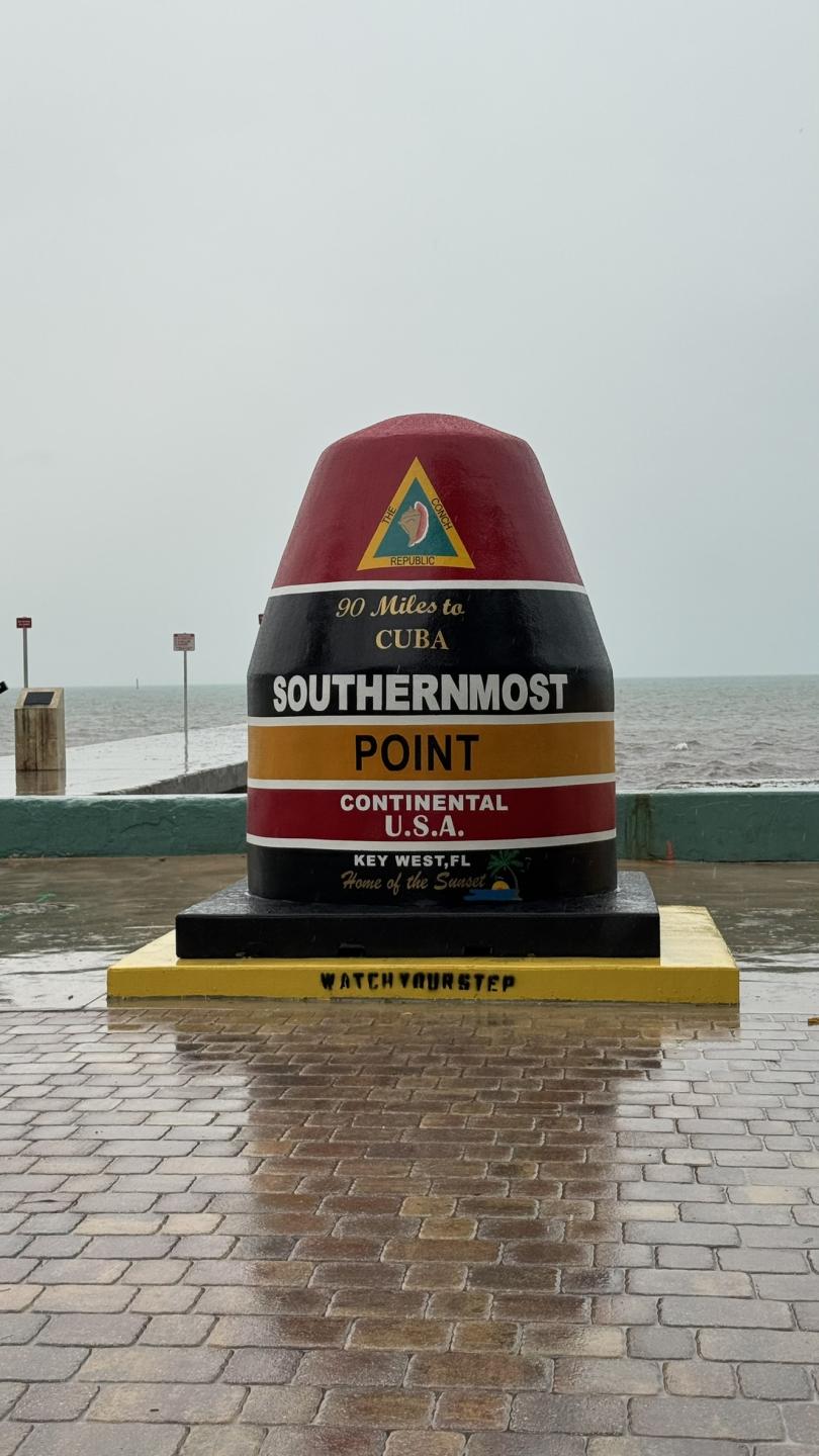 Die restliche Fahrt nach Key West war dann unspektakulär, die Strecke über den Overseas Highway konnte aufgrund des Wetters nicht mit Ihrer Schönheit bei uns punkten und am Zielort angekommen, floss uns das Wasser beim Aussteigen aus dem Auto im wahrsten Sine des Wortes um die Knöchel. Die Gullis konnten die Regenmassen nicht bewältigen und man hätte vermutlich auf den Straßen SUP fahren können. Aber egal, wenn wir schon hier waren, wollten wir natürlich auch ein Foto mit der Southernmost Point Tonne machen, also wateten wir von Kopf bis Fuß nass durch die Pfützen zur… Moment mal, weißen Tonne? War die nicht sonst bemalt? Natürlich hatten wir uns für den Besuch den kurzen Zeitraum ausgesucht, in dem die Tonne renoviert wird 🥲. Das konnte man sogar auf der Webcam sehen, die die Tonne immer zeigt. Die Ernüchterung war groß, aber so ein Foto einer weißen Tonne hat ja auch nicht jeder, oder?