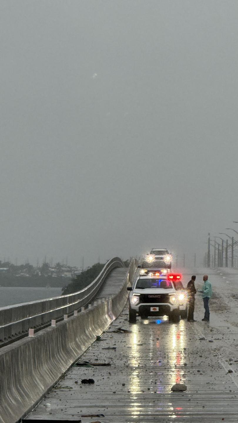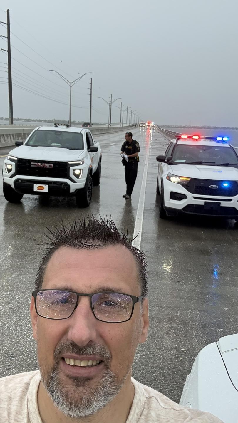 Auf einer der Brücken direkt hinter Key West lagen dann mitten im nächsten Gewitterguss plötzlich direkt vor uns sehr viele große und kleine Steinbrocken auf der Straße, denen wir nicht mehr ausweichen konnten. Neben und hinter uns fuhren natürlich viele Fahrzeuge, die Sicht war schlecht und so fuhren wir in relativ hoher Geschwindigkeit über einige dieser Steine, es rumste, krachet und schepperte und wir kamen mit einem riesigen Schrecken am Fahrbahnrand zum Stehen. Niemanden von uns war etwas passiert, aber ob das Auto nun noch fahrtüchtig war, blieb abzuwarten. Polizei und Sheriff sowie ein Räumfahrzeug kamen, der Verkehr wurde an uns vorbei auf einer Spur vorbeigeleitet. Marco und der Sheriff legten sich auf den nassen Asphalt um unser Auto zu checken. Ein Abschlepper für uns wurde gerufen, wann der kommen konnte, war aber fraglich. Deswegen versuchten Marco und der Sheriff im strömenden Regen, unseren Wagen irgendwie fahrtauglich zu bekommen und sie entfernen ein Felsstück, was sich im Radkasten verklemmt hatte. Ein kurzer holpriger Test, aber der Wagen fuhr tatsächlich wieder. Wie lange noch und wie der Unterboden aussah oder ob es nicht sichtbare Schäden gab, konnten wir natürlich alle nicht abschätzen.