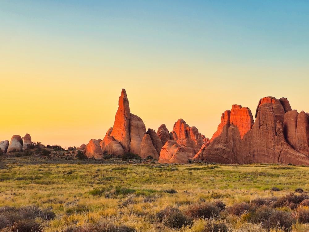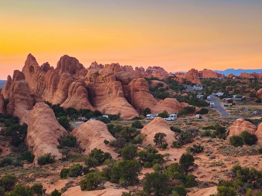 Mit den ersten Sonnenstrahlen ging ich vom Campground aus zum Tapestry Arch und genoss die Ruhe bevor die anderen wach wurden. Um 09:15 Uhr standen dann alle am Devils Garden Trailhead in Wanderausrüstung bereit. Landscape, Navajo, Partition und Double O Arch wurden digital verewigt. Alicia wollte dann aber unbedingt zurück zum RV und so gingen sie und Manuela den gleichen Weg zurück. Mark, Rafael und ich wollten aber unbedingt den als schwierig angegebenen Primitive Trail nehmen. Also nichts wie los. Doch nach 500m kehrten wir wieder um. Falscher Weg! Nochmals von vorn. Der schöne Trail führte uns dann noch 1-2 Mal in die Irre. Für trittsichere Wanderer ist der 12km lange Trail auch in Turnschuhen gut zu meistern. Am Nachmittag entspannten wir am Campground. Ich genoss dabei die erfrischende Aussendusche am RV. Bis dahin als überflüssiges Feature abgetan, erwies sie sich in diesem Moment als richtige Wellnessdusche. Um 17:00 Uhr fuhren wir los zum Highlight im Arches NP - dem Delicate Arch. Nach felsigen 2.5km Weg war es geschafft. Was für ein Moment, wenn man nach den Treppen rechts um den Felsen schaut! In voller Pracht leuchtete er im goldenen Abendlicht. Viele Menschen aus allen möglichen Nationen liessen sich diesen Augenblicklich ebenfalls nicht entgehen und reihten sich als Selfie-Touristen vor dem Bogen auf und liessen kaum einen freien Blick auf den Delicate Arch. Kurz nach Sonnenuntergang machten wir uns auf den Weg und fuhren in der Dunkelheit zurück zum Campground. Nach einem kulinarischen Highlight - einer warmen Büchse Ravioli - ging es dann nach dem Zähneputzen und einer Folge Winnetou Hörspiel ab ins Bett. So ein RV ist eben schon praktisch.