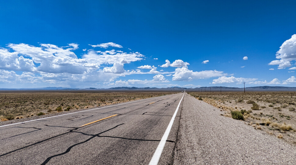 Enttäuscht und ratlos geht es weiter, denn von weiteren lohnenswerten Stopps auf der heutigen Etappe wissen zumindest wir nichts. So fahren wir nun über schnurgerade bis zum Horizont reichenden Highways. Auf dem Navi taucht dazu auf einmal der Extraterrestrial Highway auf. Das Einheimische hier Ufos gesehen haben wollen wundert uns angesichts der (durchaus faszinierenden) Monotonie nicht wirklich…