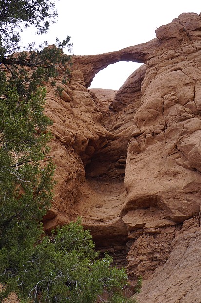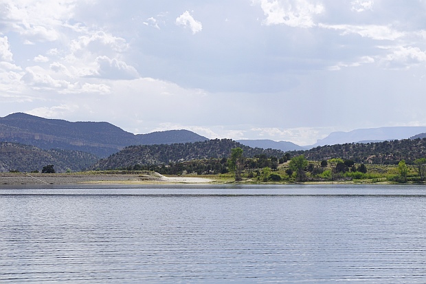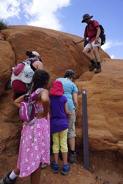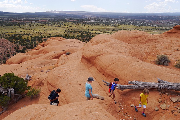 Nun geht es ein Stück Gravel Road zum Slickrock Trail, der am Shakespeare Arch vorbei ebenfalls tolle Fernblicke bis zum Bryce Canyon ermöglicht. Dort hängen immer noch ein paar Gewitterwolken vom Vortag und ein paar Tropfen bekommen auch wir ab. Auch die Kinder haben viel Freude an dem recht einfachen aber sehr abwechslungsreichen Trail mit einfachen Kletterstellen, tollen Ausblicken, einem Arch und starke Farbkontraste der roten Felsen, saftig-grünen Wiesen und weißen Bergspitzen. Bevor wir vom Parkplatz wieder wegkommen, müssen wir mit unseren 2 Schlachtschiffen schon etwas rangieren und ich bin froh, dass wir einen uns entgegenkommenden PKW so frühzeitig sehen, dass wir ihn an einer der wenigen breiteren Stellen passieren lassen können.