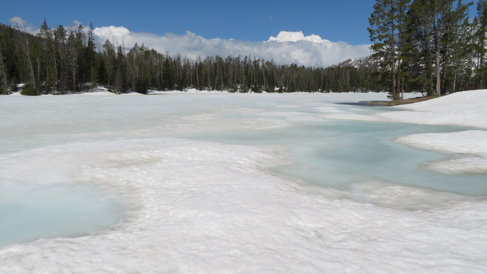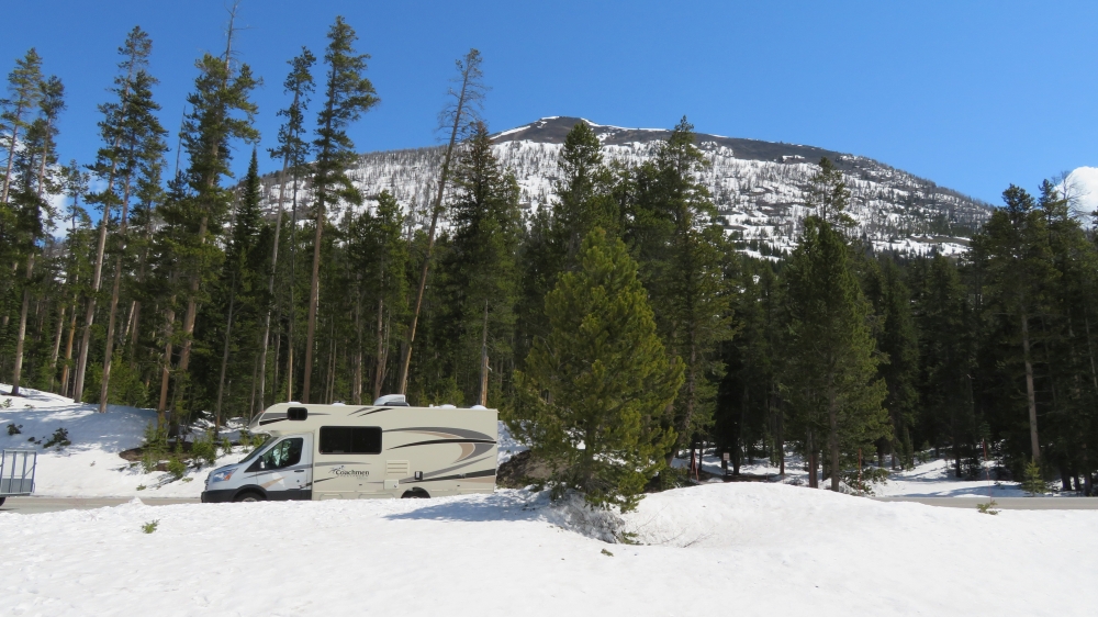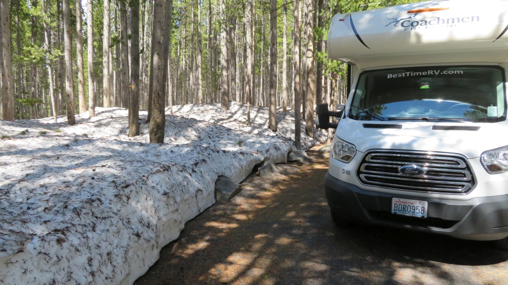 Es liegt noch so viel Schnee, das nicht alle Loops geöffnet sind. Unsere Feuerstelle und der Tisch mit Bänken liegen unter dem Schnee begraben.