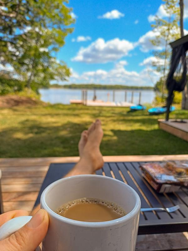 Die Sonne scheint vom strahlend blauen Himmel und wir beschließen einfach heute am Ferienhaus zu bleiben, zu Schwimmen, die Kajaks zu nutzen und einfach wegen des Jetlags nichts zu übertreiben. Ich baue mit Jonne den Grill zusammen. Anschließend lassen wir die Kajaks mal zu Wasser und paddeln eine Runde. Zum Mittagessen machen wir einfach ein paar belegte Baguetts. Die Kinder legen sich anschließend zur Mittagsruhe hin und schlafen dabei auch ein. Nach der Mittagsruhe wollen sie unbedingt auch eine Runde mit Kajak fahren und auch noch eine Runde in den Whirlpool. Jan beschließt auf die andere Seite des Sees zu schwimmen (ca. 900m), allerdings ist es bei ihm eher ein Zickzack Kurs. Als er fast auf der anderen Seite ist, stechen Malou und ich mit einem Kajak in See und versuchen Jan einzuholen, was natürlich auch gelingt. Anschließend darf auch noch Elenor eine Runde mitfahren.