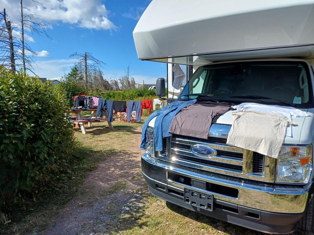 Dort beobachten wir die üblichen Wassertiere wie Frösche und Libellen. Anschließend treten wir den Rückweg zum Campingplatz an. Es ist inzwischen richtig warm geworden. Zum ersten Mal stört es uns, dass wir die Markise nicht nutzen können. Diese sind bei allen Canadream-Fahrzeugen deaktiviert. Nach dem Mittagessen starten wir noch eine Wäsche. Hier gibt es genügend Waschmaschinen. Wir entfliehen der Sonne nach innen und ruhen uns etwas aus bis die Wäsche fertig ist. Da es keinerlei Bäume gibt um die Wäscheleine zu spannen, legen wir einen Koffer auf den Außentisch und spannen so die Wäscheleine zu einem Griff neben der Tür. Nach der obligatorischen Kaffeerunde geht es dann an Strand. Hier gibt es jede Menge runde, flache Steine die man prima springen lassen kann. Die Kinder graben im Sand und sammeln Muscheln.
