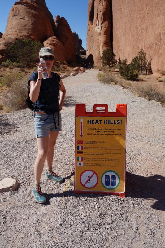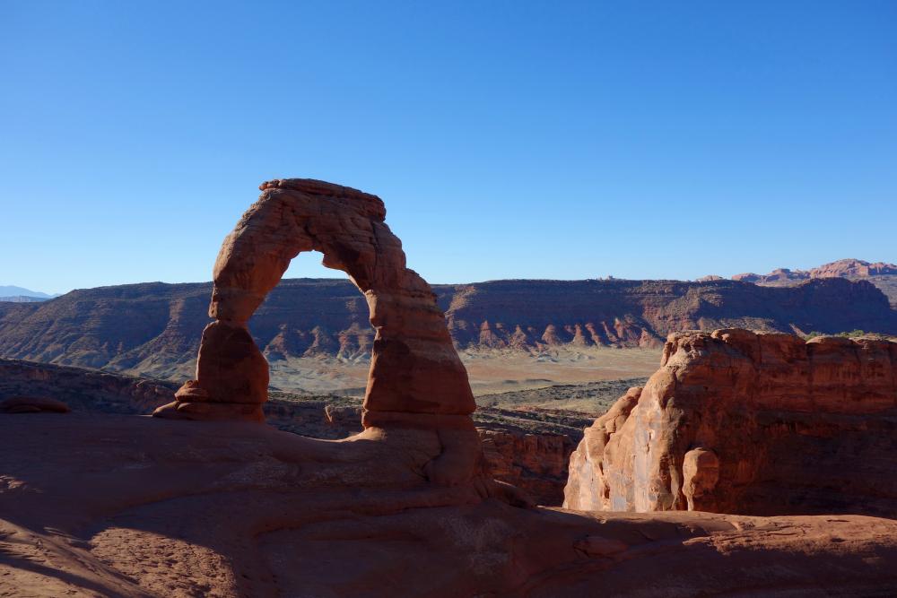 Heute morgen stehen wir in aller Herrgottsfrühe auf, denn wir wollen nur eins: wieder in die Natur! Und es lohnt sich, um 8 Uhr stehen wir auf dem Trail zum Delicate Arch im Nationalpark. Die Wanderung ist kurz (60 min hin und zurück), nichtdestotrotz haben wir am nächsten Tag erfahren, dass dort schon Touristen gestorben sind, erst kürzlich ein Tourist. Für uns ziemlich unverständlich, da die Wanderung kurz ist und auch in der Früh schon zahlreiche Menschen auf dem Trail waren. Jetzt jedenfalls wird am Eingang kontrolliert, ob denn auch jeder Touri genügend Wasser mitführt. Der Delicate Arch ist wirklich beeindrucken, denn anders als seine vielen Namensvetter ist er relativ schmal und hoch und steht völlig frei in der Landschaft, was eine besonders majestätische Wirkung hat. Nicht zu unrecht kann er sich stolz Utahs Staatsymbol schimpfen!