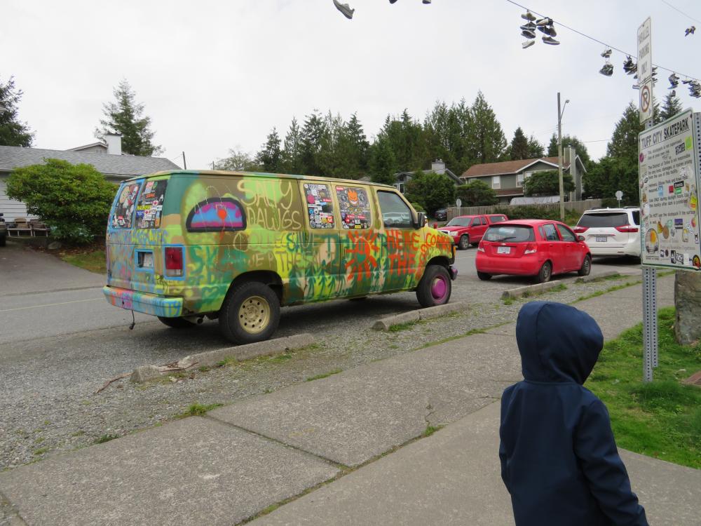 . Auf dem Rückweg zum Wohnmobil finden wir einen kleinen Park mit Spielplatz und verbringen dort noch ein bisschen Zeit. Auch eine Skatebahn ist in der Nähe und aus einem bunten Bus steigt ein bestimmt 40 Jahre alter Mann mit langer, blonder Mähne aus. Typisch Surferboy