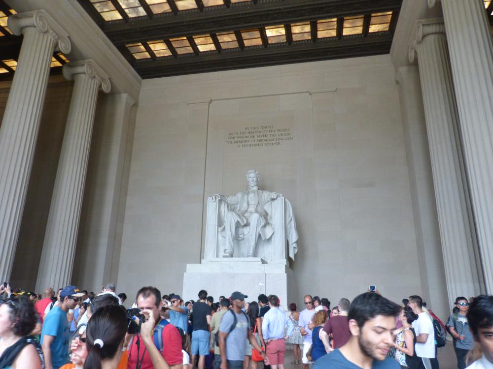 Anschließend sind wir dann auf die National Mall spaziert und vorbei an den Museen des Smithsonian in Richtung Washington Monument gelaufen. Unterwegs bot uns ein junges amerikanisches Paar ihre Baby-Sonnencreme an, da wir gerade das Sonnensegel am Kinderwagen richteten. Sonnencreme hatten wir zwar selber, aber so kamen wir mit den beiden ins Gespräch. Sie waren mit ihrem 6 Monate alten Sohn über das WE nach Washington gekommen. Die drei leben in Staten Island, welches der südliche Stadtteil von New York ist. Wir waren uns scheinbar alle vier sympathisch, so dass wir den Spaziergang über die National Mall gemeinsam fortsetzten. Am Ende der Mal steht das berühmte Lincoln Memorial, wo Abraham Lincoln in Mamor gehauen auf einem Stuhl sitzt. Das Gebäude ist in vielerlei Hinsicht beeindruckend. Erstens waren hier mehr Touristen als irgendwo anders, zweitens sind sowohl das Gebäude, als auch die unter dem Dach befindliche Statue aufgrund ihrer Größe wirklich beeindruckend und drittens ist es eine der Sehenswürdigkeiten, welche man schon sehr oft in Filmen und Serien sehen konnte und nun in natura bewundern kann.
