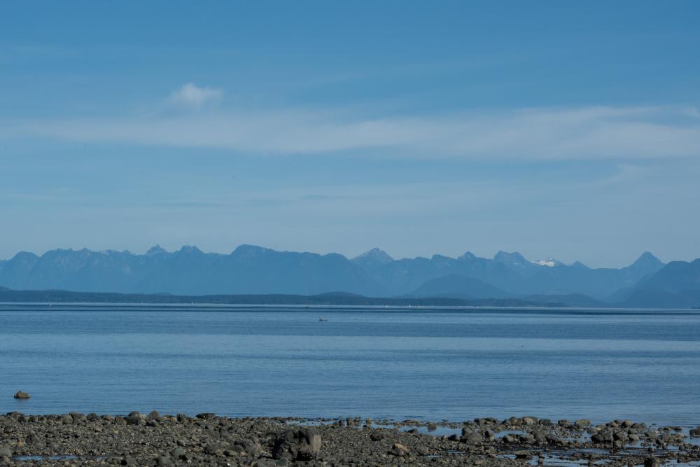 In Port Alberni erledigen wir nochmals unsere Einkäufe und fahren dann nonstop weiter bis kurz vor Campbell River, wo wir den Highway verlassen und an der Küste einen kleinen Picknick-Rast machen. Der Blick auf die Coast Mountains ist bei diesem Wetter ein Gedicht.