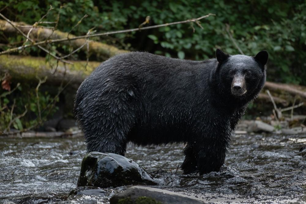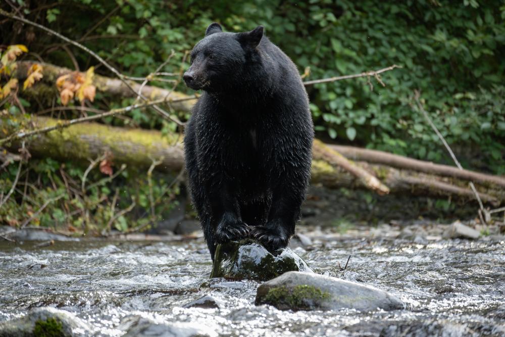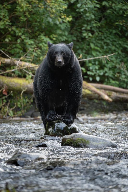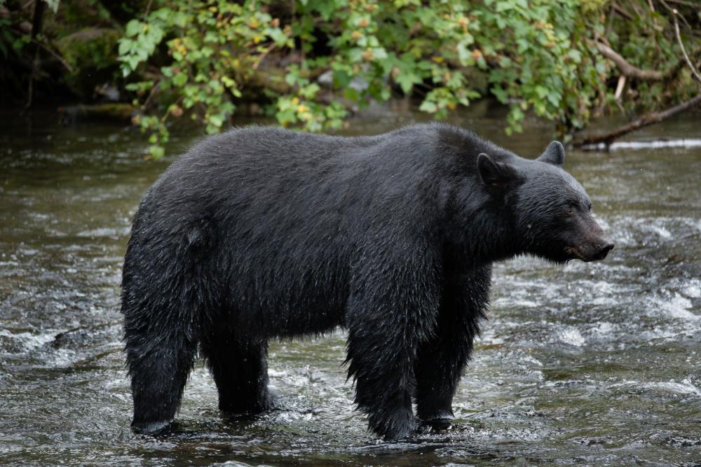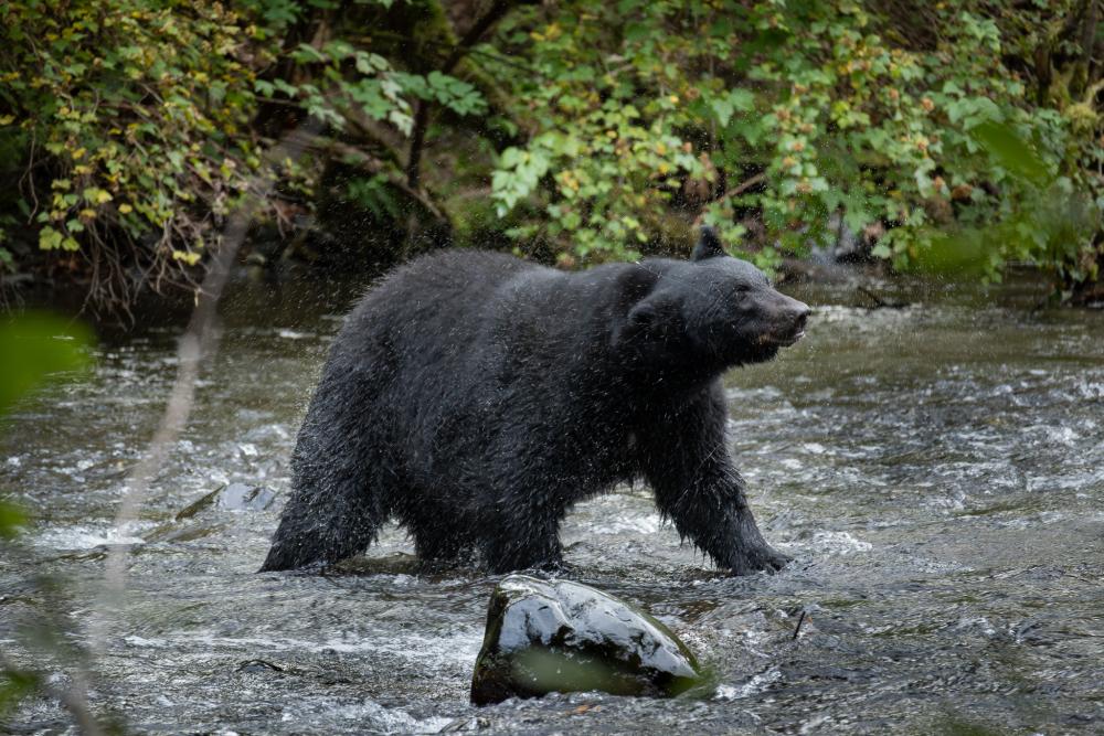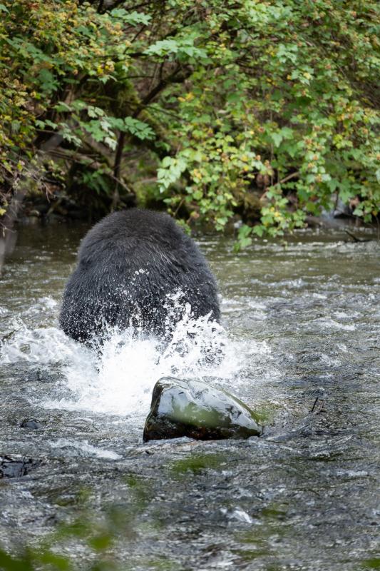 , direkt dahinter ein wunderschöner, gut genährter Schwarzbär auf Lachssuche. Aufgeregt suchen wir ein Plätzchen, sind zu Beginn noch etwas zaghaft und weiter entfernt, nähern uns dann aber wie die anderen Menschen etwas näher an das imposante Tier heran.
