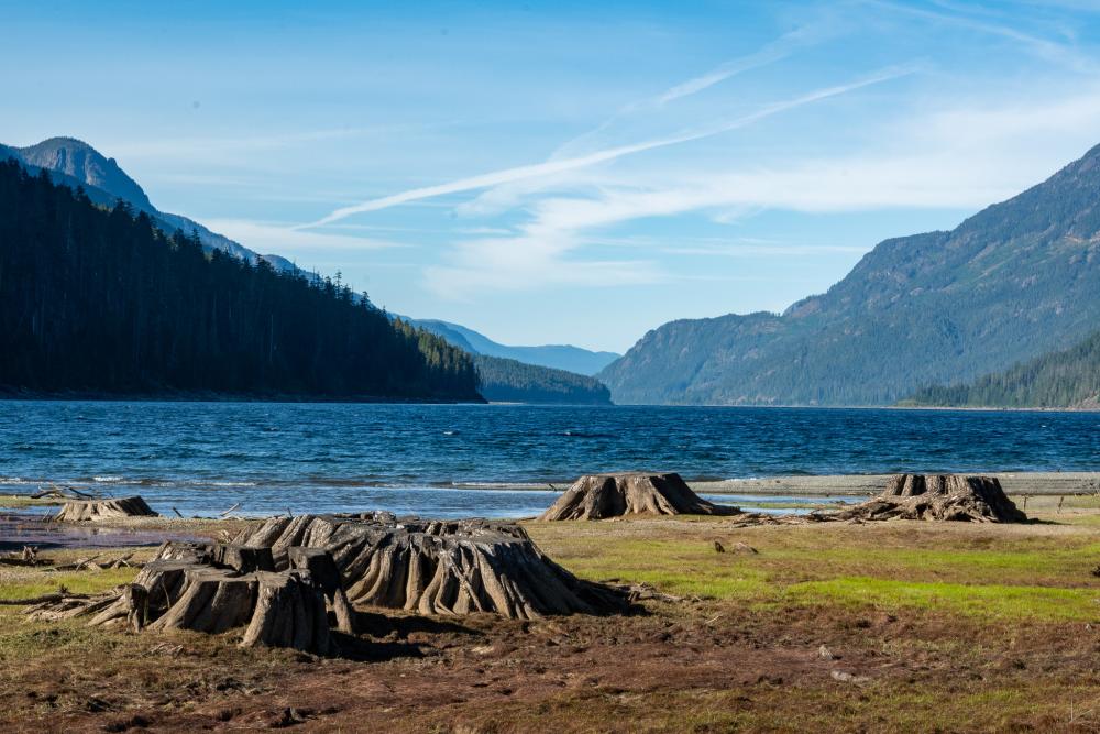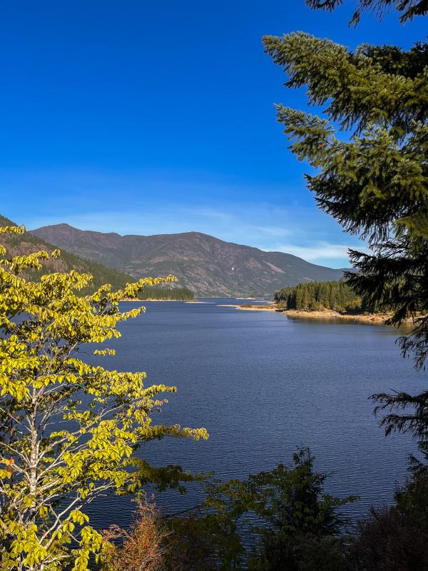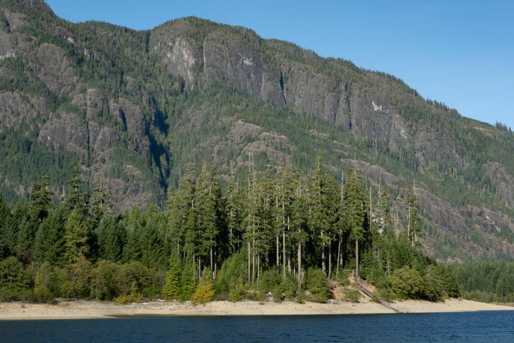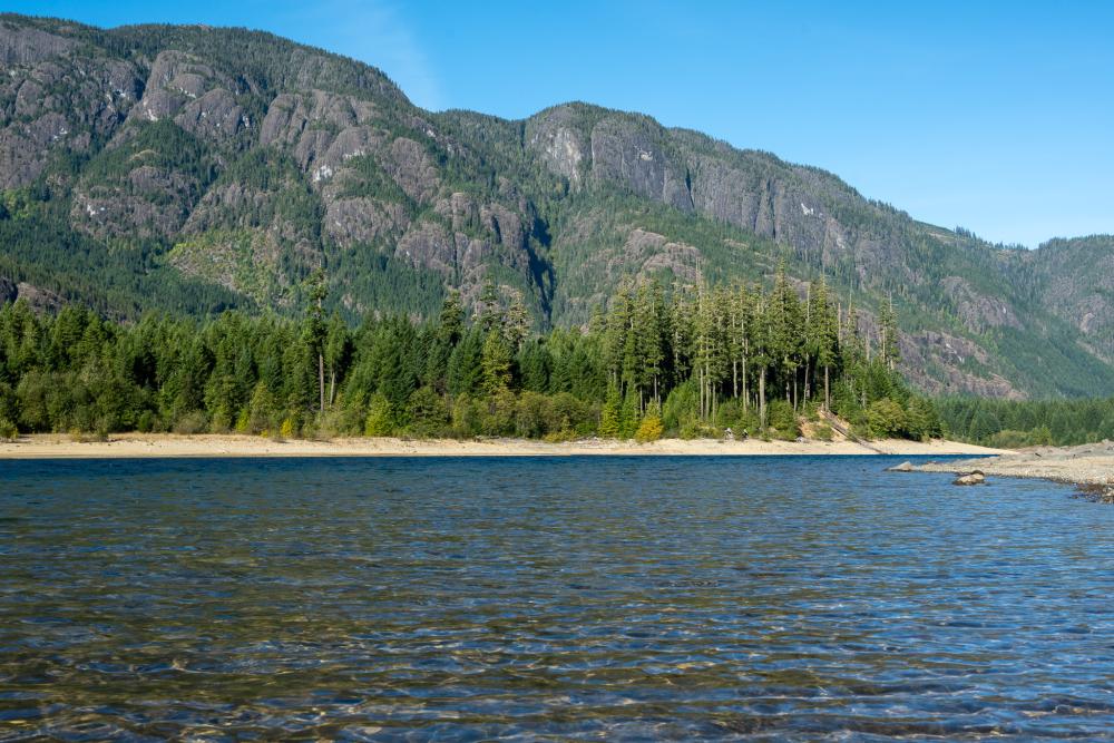 Die Sonne lacht von einem wolkenlosen Himmel und wir geniessen die halbstündige Fahrt, bis wir die ersten Ausläufer des Upper Campbell Lake erreichen. Ab hier wird die Landschaft abwechslungsreicher, in der Ferne sieht man die Berge.