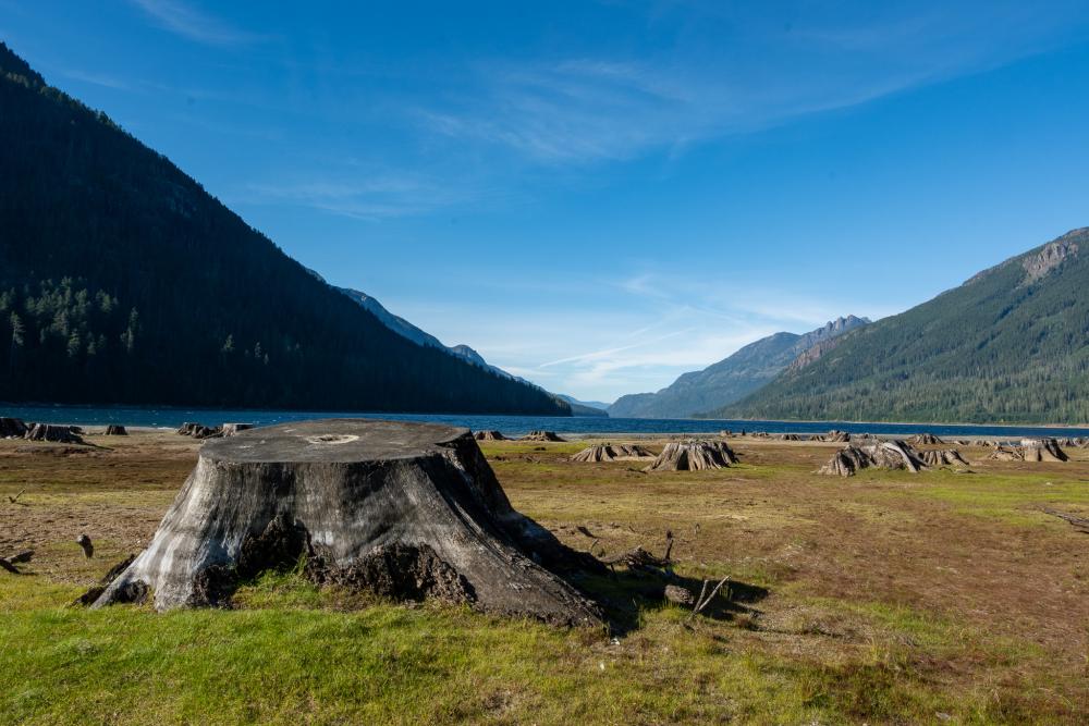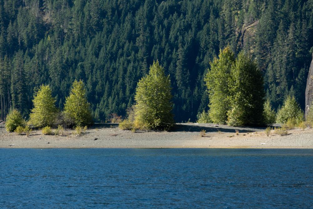 Zum Glück sind wir früh beim Campground eingetrudelt, wie vermutet verschwindet die Sonne bald einmal hinter der Bergkette. Bis dahin laufen wir jedoch noch zum Wasser. War der See immer so weit weg vom Campingplatz? Die Baumstrünke sind auf jeden Fall nach wie vor so fotogen wie dazumal.