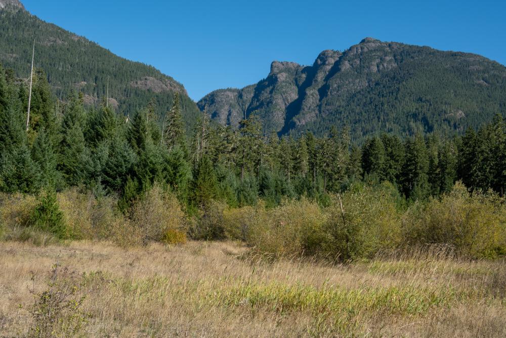 Eigentlich wollten wir noch bis zum See hochfahren, aber ein grosser Stein versperrt das Weiterkommen. So parkieren wir am gut gefüllten Parkplatz und überlegen uns, was wir unternehmen wollen. Den Bedwell Lake Trail zu laufen, wäre ja sehr verführerisch, aber schon nur der Aufstieg bis zum See dauert ca. 2.5 Stunden, dafür sind wir zu dieser Jahreszeit einfach zu spät dran.