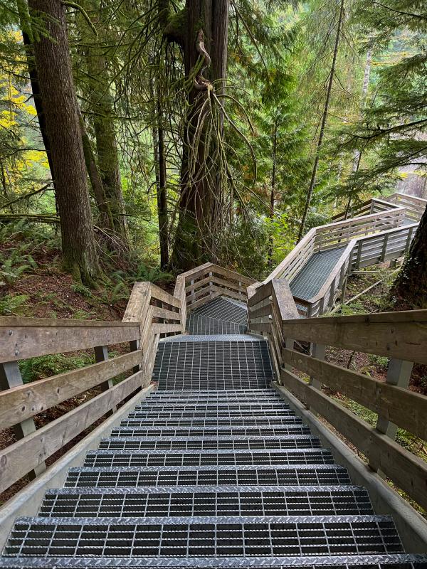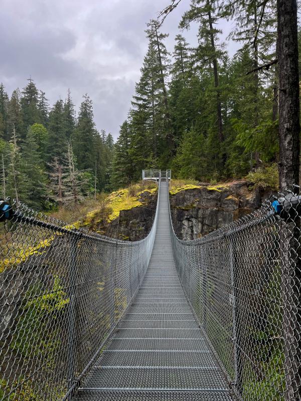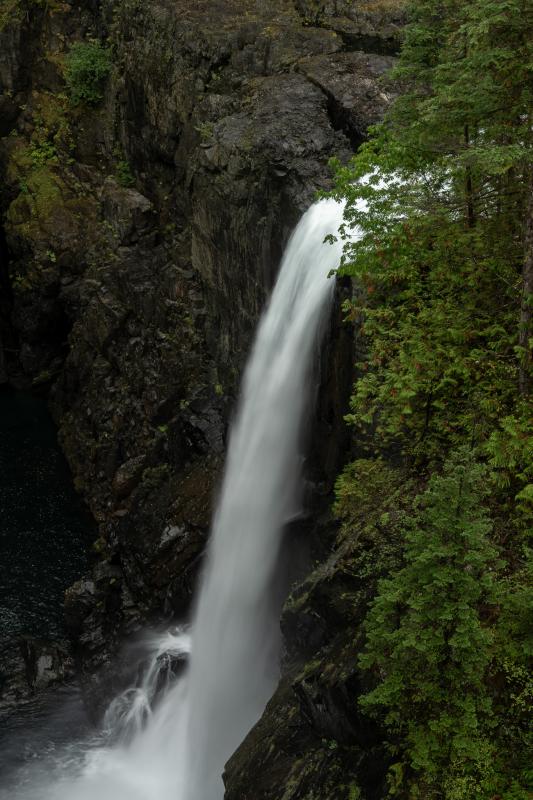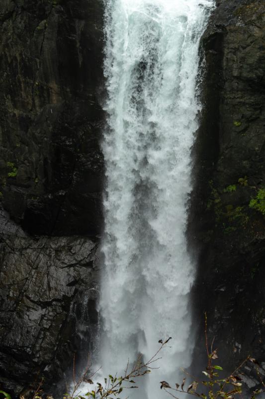 Trotz Regen entscheiden wir uns, zunächst die Elk Falls zu besuchen. In strömendem Regen macht dies zwar nicht so Spass, dafür sind wir praktisch allein.