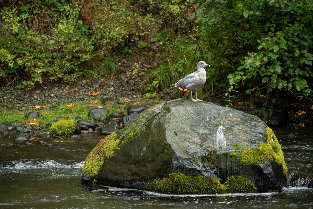 Danach folgt ein letzter Besuch ‘unserer Bären’ am Quinsam River. Den Fehler vom letzten Mal wiederholen wir nicht und fahren direkt vom Elk Falls zum Parkplatz bei der Brücke. Da bereits alle Plätze belegt sind, parkieren wir etwas weiter oben am Strassenrand und laufen über die Strasse zur Hatchery und den kurzen Weg dem Fluss entlang zu unserem Spot.