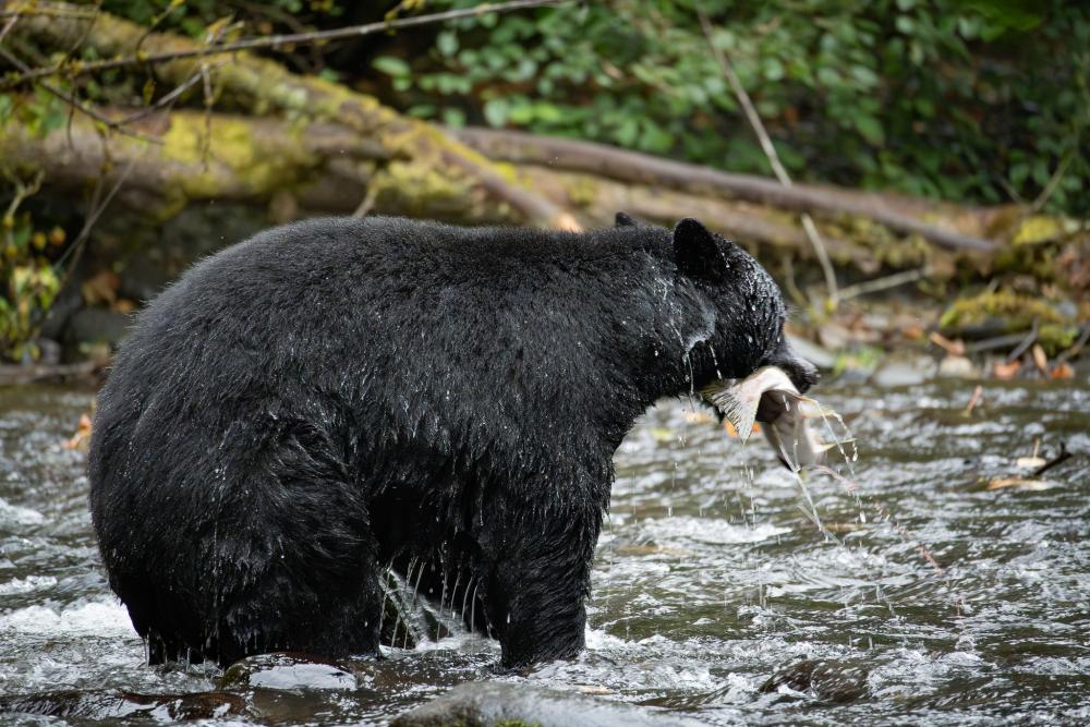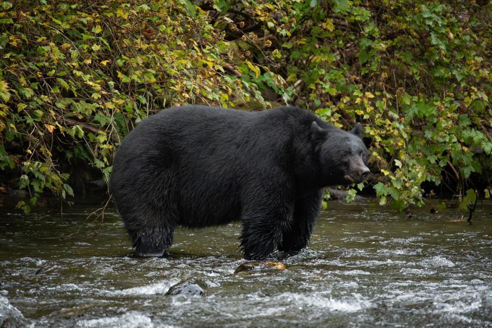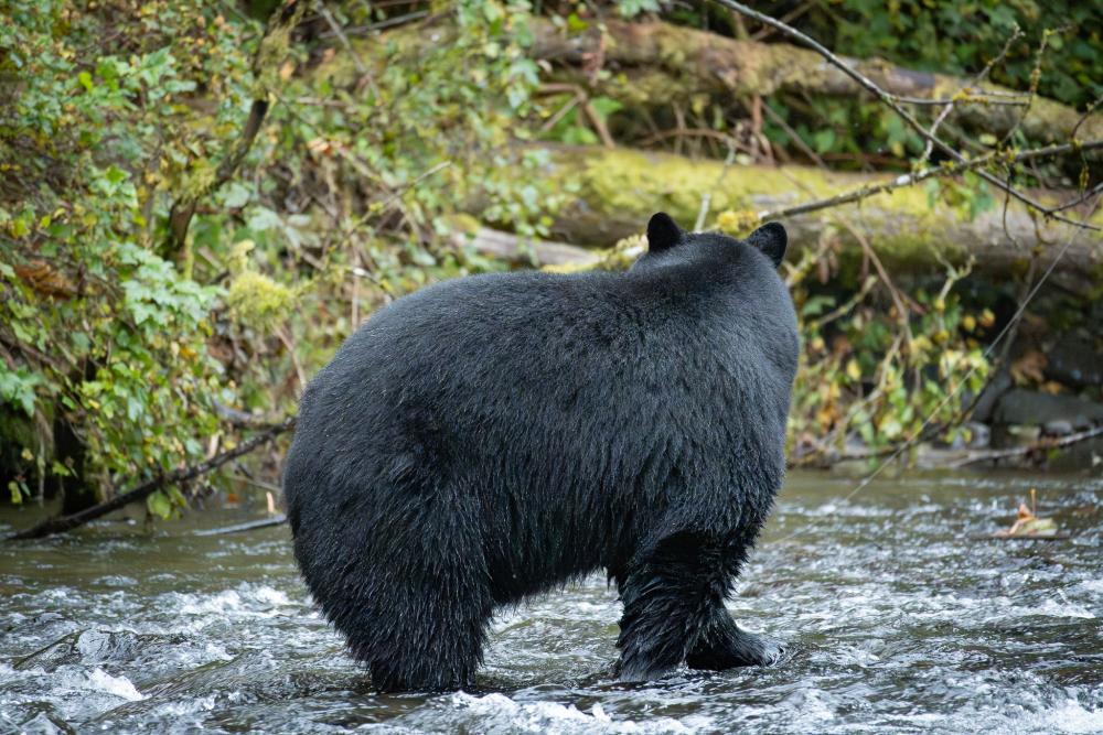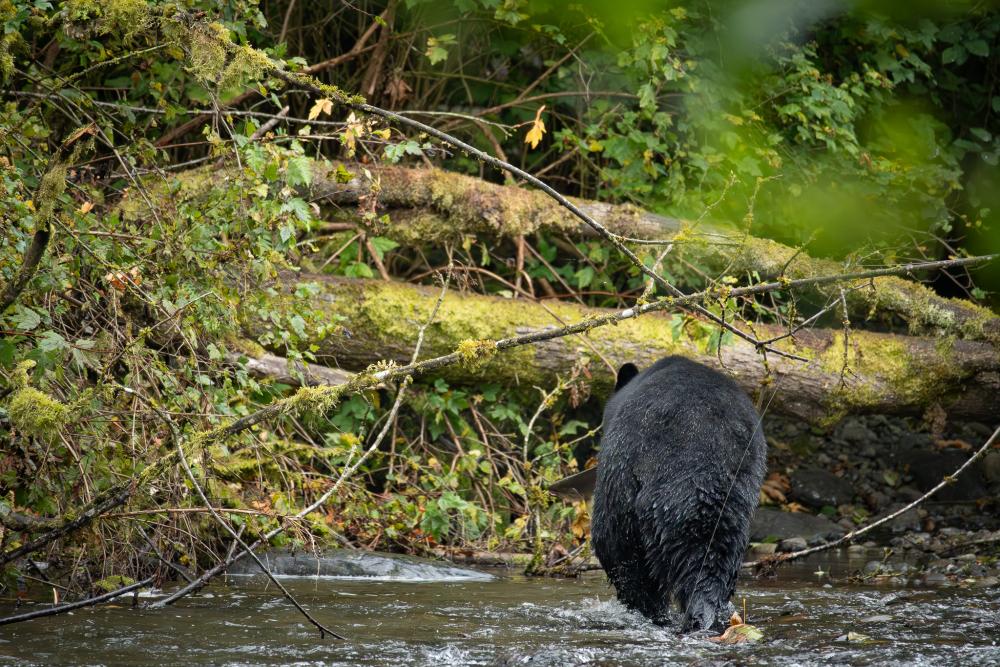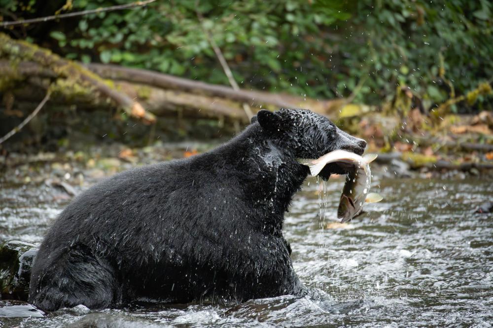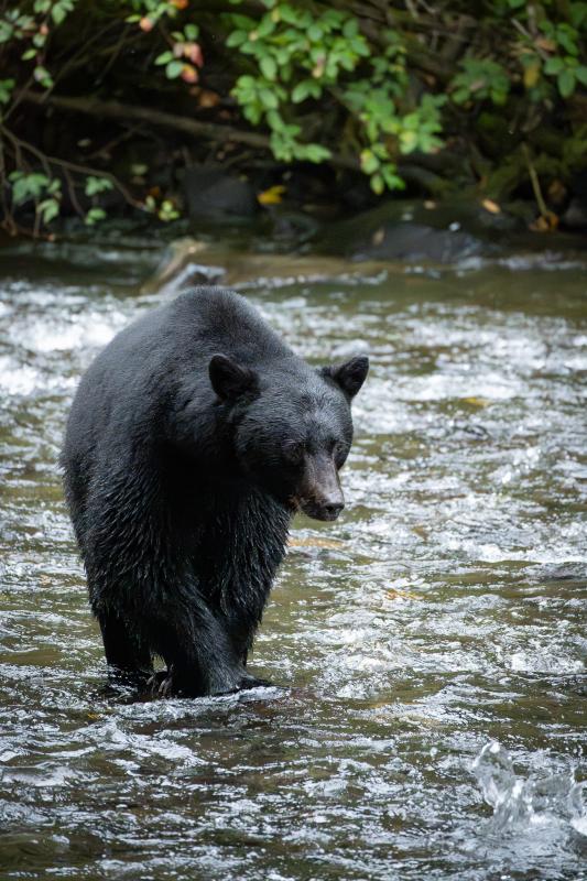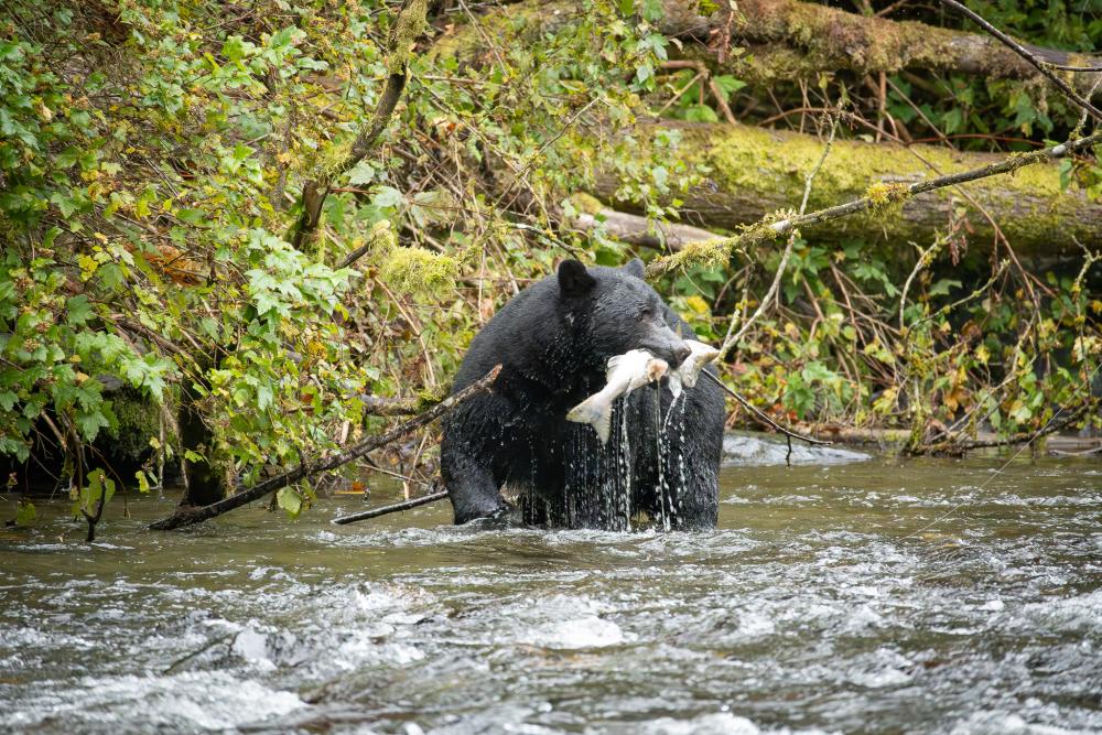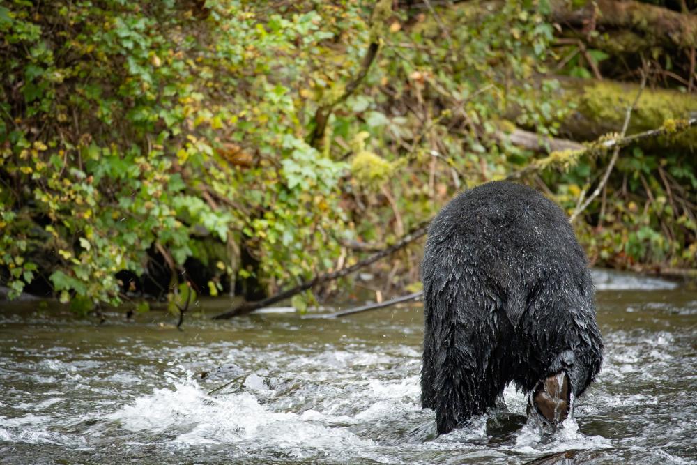 Ob er oder sie nochmals einen Lachs gefangen hat, entzieht sich unseren Kenntnissen. Die Lichtverhältnisse sind mittlerweile schlecht fürs Fotografieren und die Dämmerung ist schon sehr weit fortgeschritten. Daher sagen wir schweren Herzens «goodbye Quinsam River Bear» und verlassen unseren Traumspot.