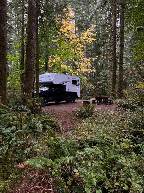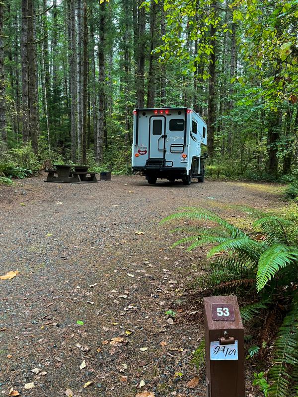 Ein neuer Plan muss her. Und wie heisst es so schön: aller guter Dinge sind drei – ihr ahnt es schon, wir landen noch ein letztes Mal auf dem Quinsam CG. Es ist wie beim ersten Mal wieder Freitag, wir sind früh unterwegs und dementsprechend hat es noch zahlreiche Plätze zur Auswahl. Die Site vom letzten Mal ist leider besetzt, so nehmen wir Nr. 53 weiter unten im Loop. Diese ist auch schön und riesengross: