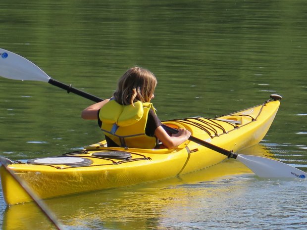 Nach dem schon viel entspannteren zweiten Kanuausflug möchten die Mädels noch Kayakfahren ausprobieren. Meilis hieven das Kayak mitsamt Kind ins Wasser: