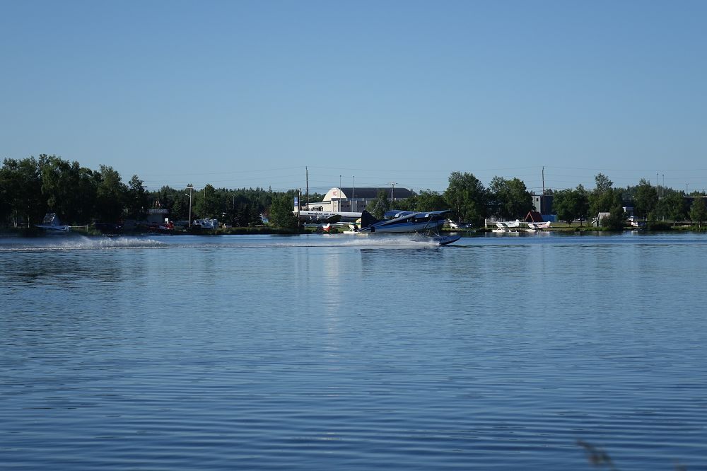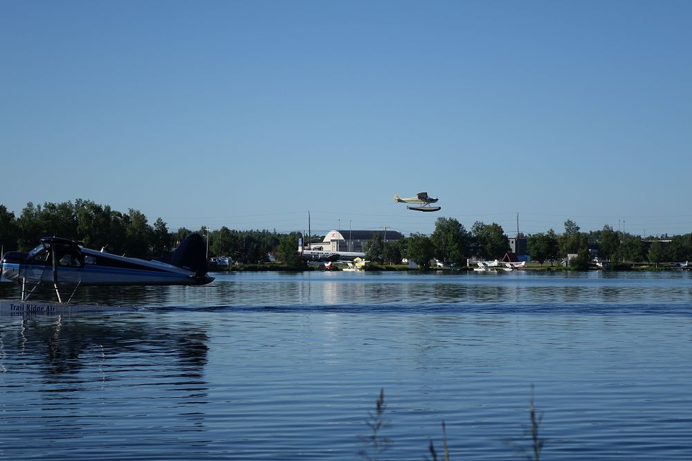 Heute Morgen waren wir gegen  9 Uhr startklar mußten aber ja noch ins Office um zu zahlen da dies gestern nach 17 Uhr schon zu war ja und was soll ich sagen Morgens wird erst um 10 Uhr aufgemacht. Aber es gab Kuverts zum selber zahlen und einschmeißen. Nachdem wir nichts von den Anschlüssen genutzt hatten zahlten wir 29 $ für eine Drysite und machten uns dann auf den Weg zum Lake Hood um uns den Wasserflugzeugflughafen anzusehen. Hier war ganz schön Betrieb ein Wassflugzeug fährt zum Start während ein anderes gerade landet und daneben starten noch die Maschinen vom daneben liegenden normalen Flughafen.