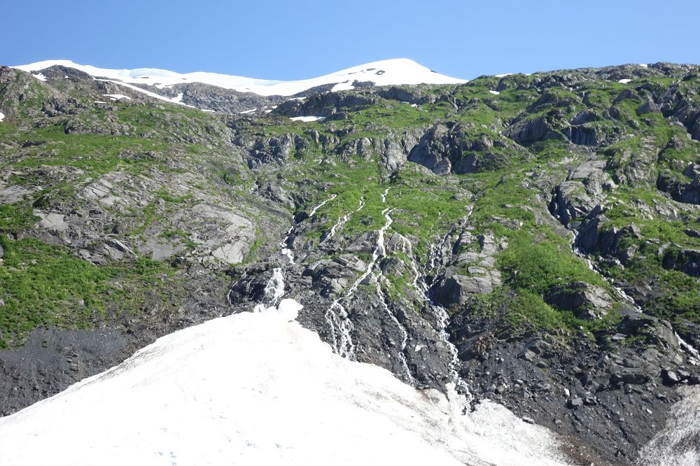 Dort angekommen waren aber nur Altschneeberge, den der Gletscher selber hat sich schon weit nach oben in die Felsen zurück gezogen, das war 2003 noch ganz anders. Aber in 14 Jahre kann sich schon einiges ändern.