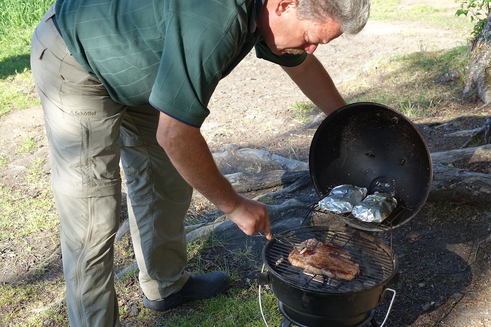 Nachdem wir uns eingerichtet hatten wurde der Grill angeschmissen und es gab Folienkartoffeln, Backed Beans und ein T-Bone Familiensteak dazu ein kühles Bierchen.