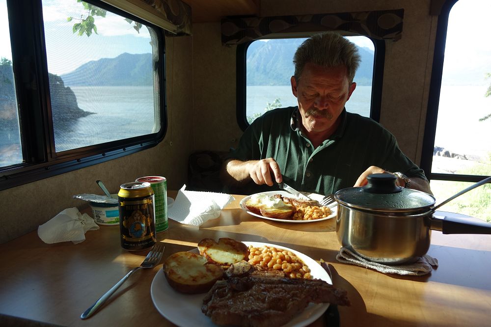 Ein perfektes Boondocking Plätzchen?. Herrlich, Werner muss immer für das Essensfoto herhalten?. Wie oft ich ihn schon im Laufe der Jahre mit Messer und Gabel gesehen habe?. Warum esst ihr eigentlich nicht draußen?