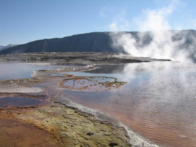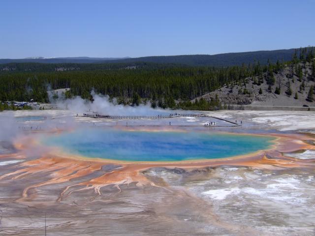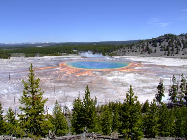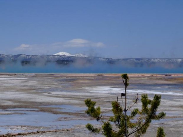 Dann gings zu einer kleinen Wanderung. Vom Trailhead für den Fairy Falls Trail.ging über den Firhole River ca. 1 km bis zu einem tollen Aussichtspunkt auf einem kleinen Hügelvon wo aus wir einen tollen Blick auf die Grand Prismatic Spring hatten.