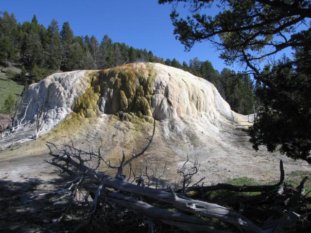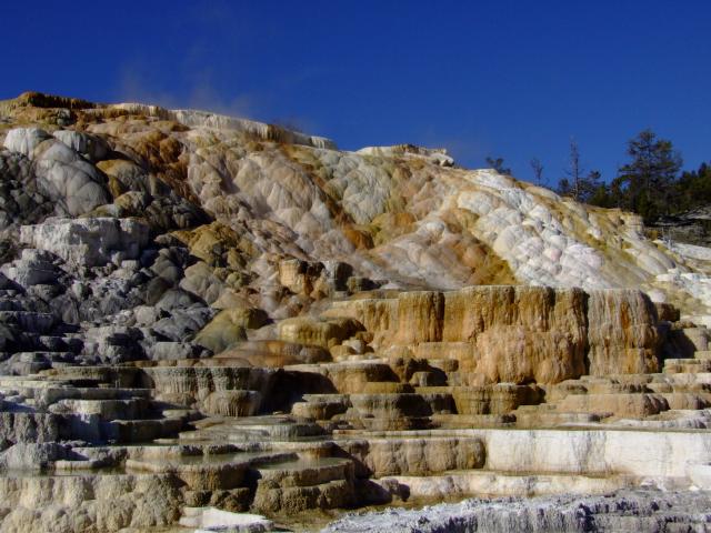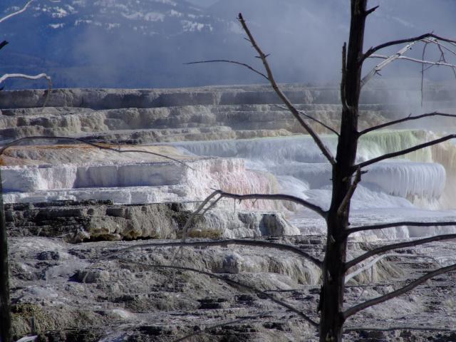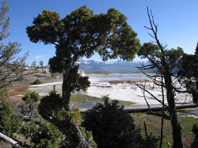 Heute sind wir nach dem Blick aus dem Fenster und erblicken eines strahlend blauen Himmels wiedermal etwas früher aufgestanden, Um 7 Uhr gabs das gemeinsame Frühstück und gegen 8 Uhr machten wir uns auf den Weg zu den Mammoth Hot Springs.