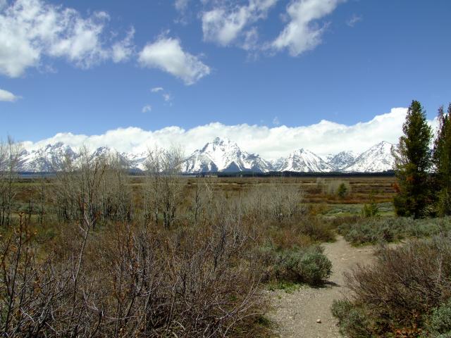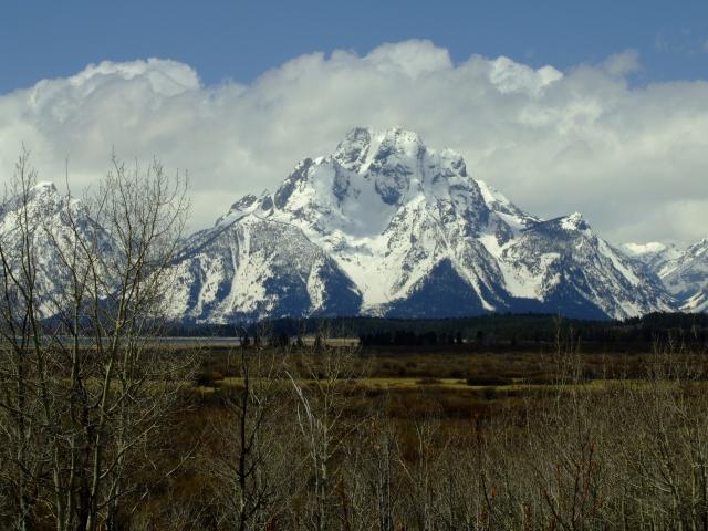 Gegen 11 Uhr machten wir uns dann auf den Weg zum Grand Teton NP. Hierbei ging es nochmal durch den tiefsten Winter mit Meter hohem Schnee neben dem Straßenrand. Im Grand Teton angekommen gab es einen Stop beim Colter Bay Visitorcenter um uns eine Parkmap zu besorgen. Erster Aussichtspunkt war beim Willow Flat Overlook wo wir die Tetons in Ihrer ganzen Pracht sahen. Zusätzlich gabs hier noch freche Vögel die gar nicht scheu waren und sich super fotographieren liesen. Es waren Yellowheadblackbirds.