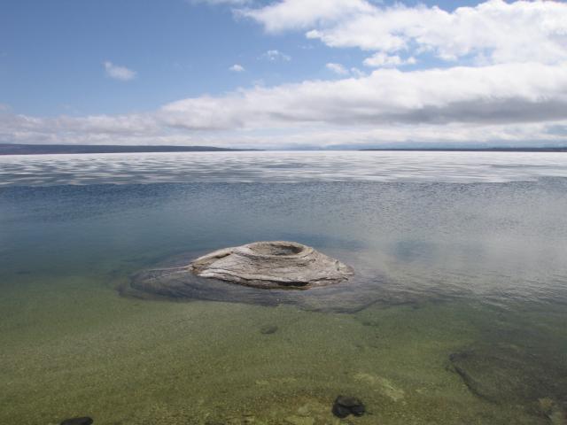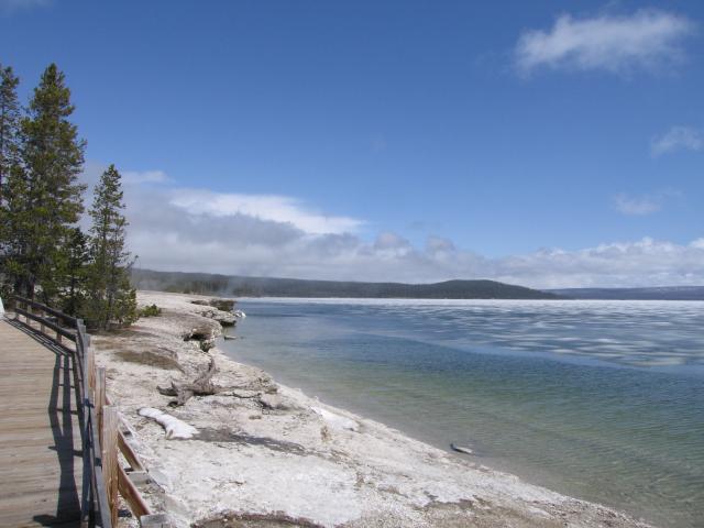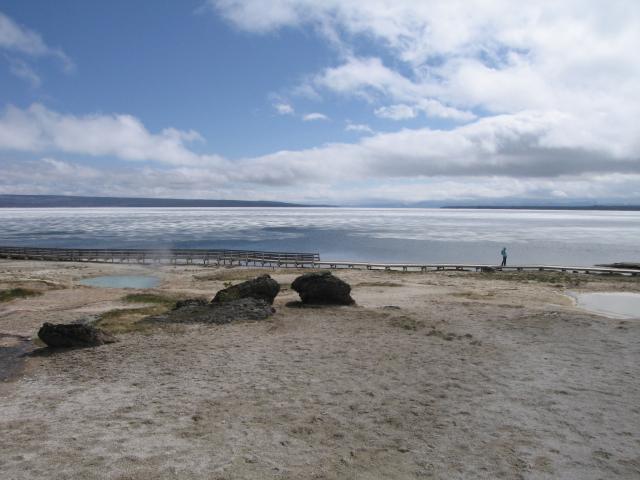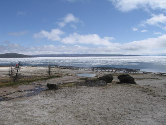 Dennoch hielten wir uns anbetracht des eisigen Windes/Sturmböen nicht lange auf. Weiter gings zum letzten Stop im Yellowstone NP dem West Thumb Geysir Basin. Hier gab es Geysirgärten zu sehen und kleine Geysire direkt am Ufer des Yellowstone Lake was schöne Motive zusammen mit dem Großteils noch gefrorenen See ergab.