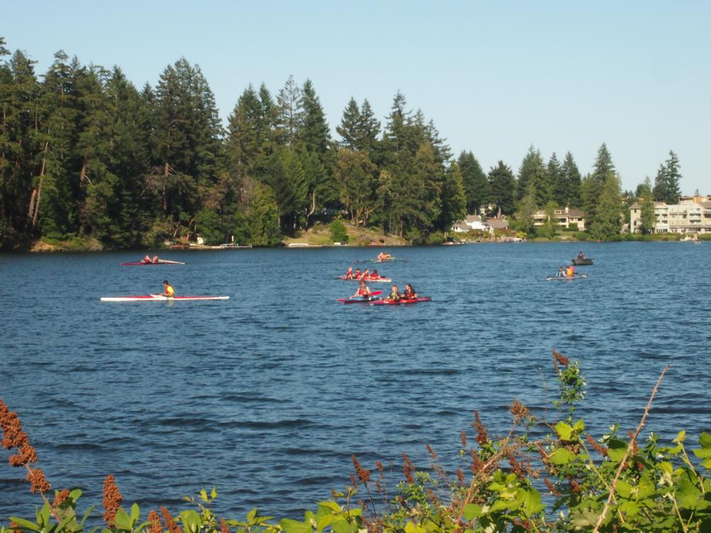 eine Uferseite flach ist und die andere bergig. Auf der bergigen Seite sieht man tolle Häuser. Auf dem See tummeln sich Ruderer und Kanuten. Ach, wäre es
