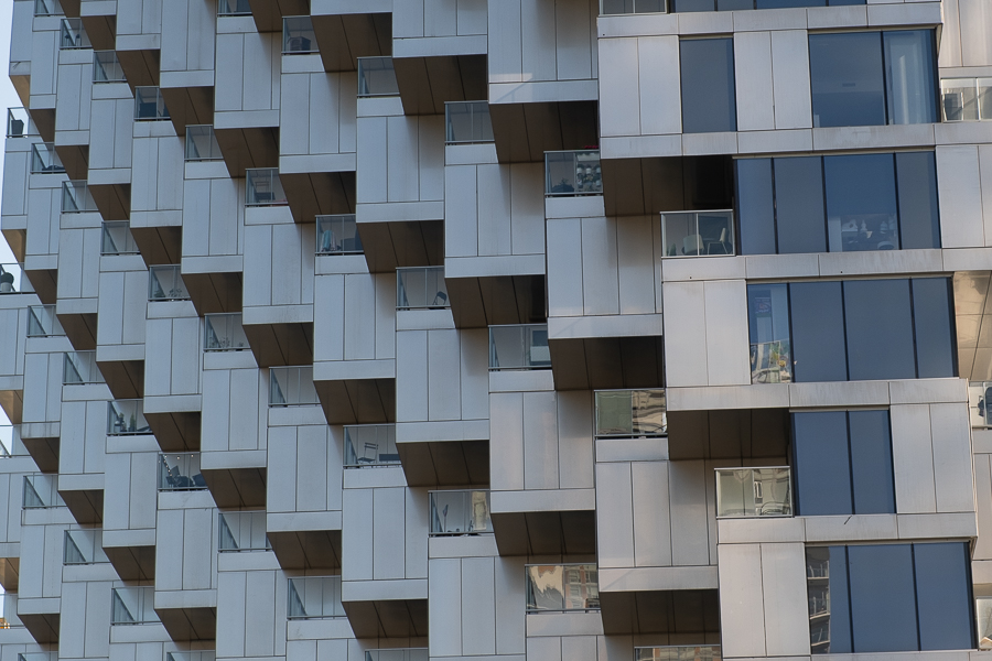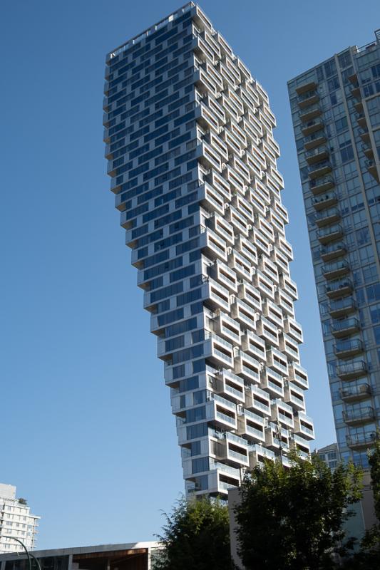 Auf dem Rückweg schauen wir uns noch das skurrile Vancouver House an. Je nach Perspektive scheint es kurz vorm Umfallen zu sein.