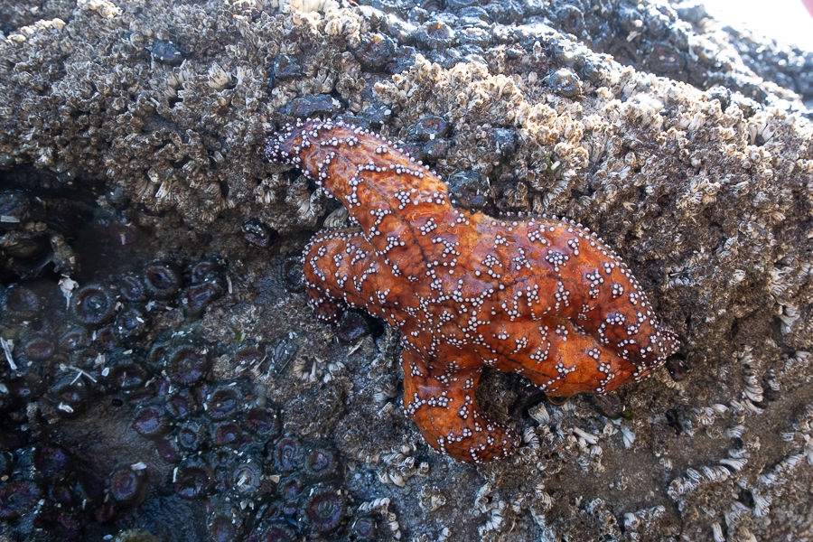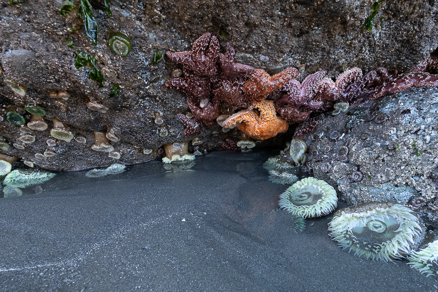 Am nächsten Tag passt es prima mit dem Niedrigwasser, denn dann kann man wunderbar das marine Leben in den Tidepools beobachten. Dazu fahren wir zum Ruby Beach, wo im nödlichen Bereich an einem Felsen eine prima Stelle ist.